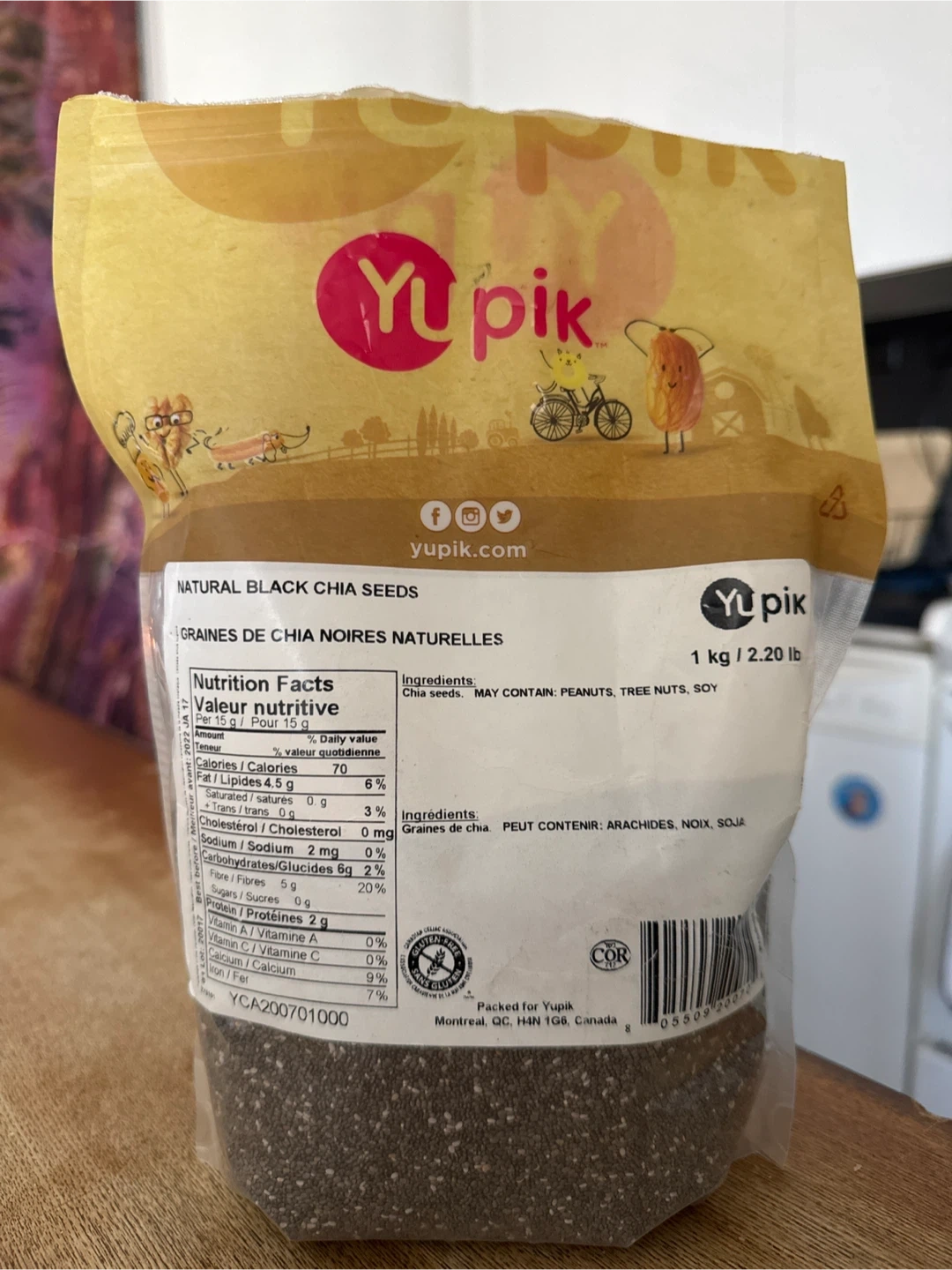 Yupik natural black chia seeds. They're packed for Yupik in Montreal, QC. Contains chia seeds and may contain peanuts, tree nuts, and soy.