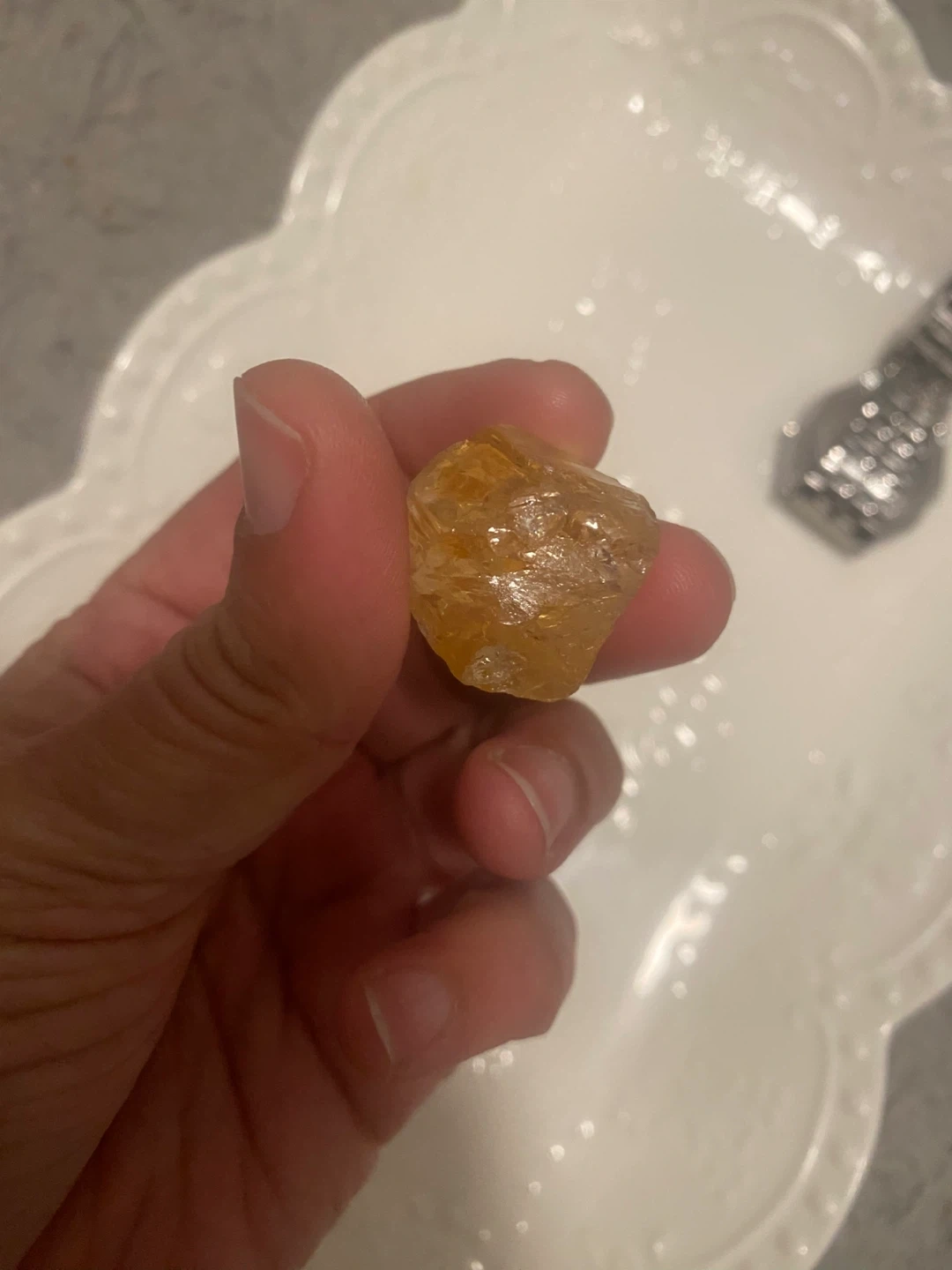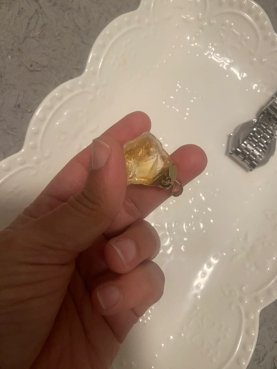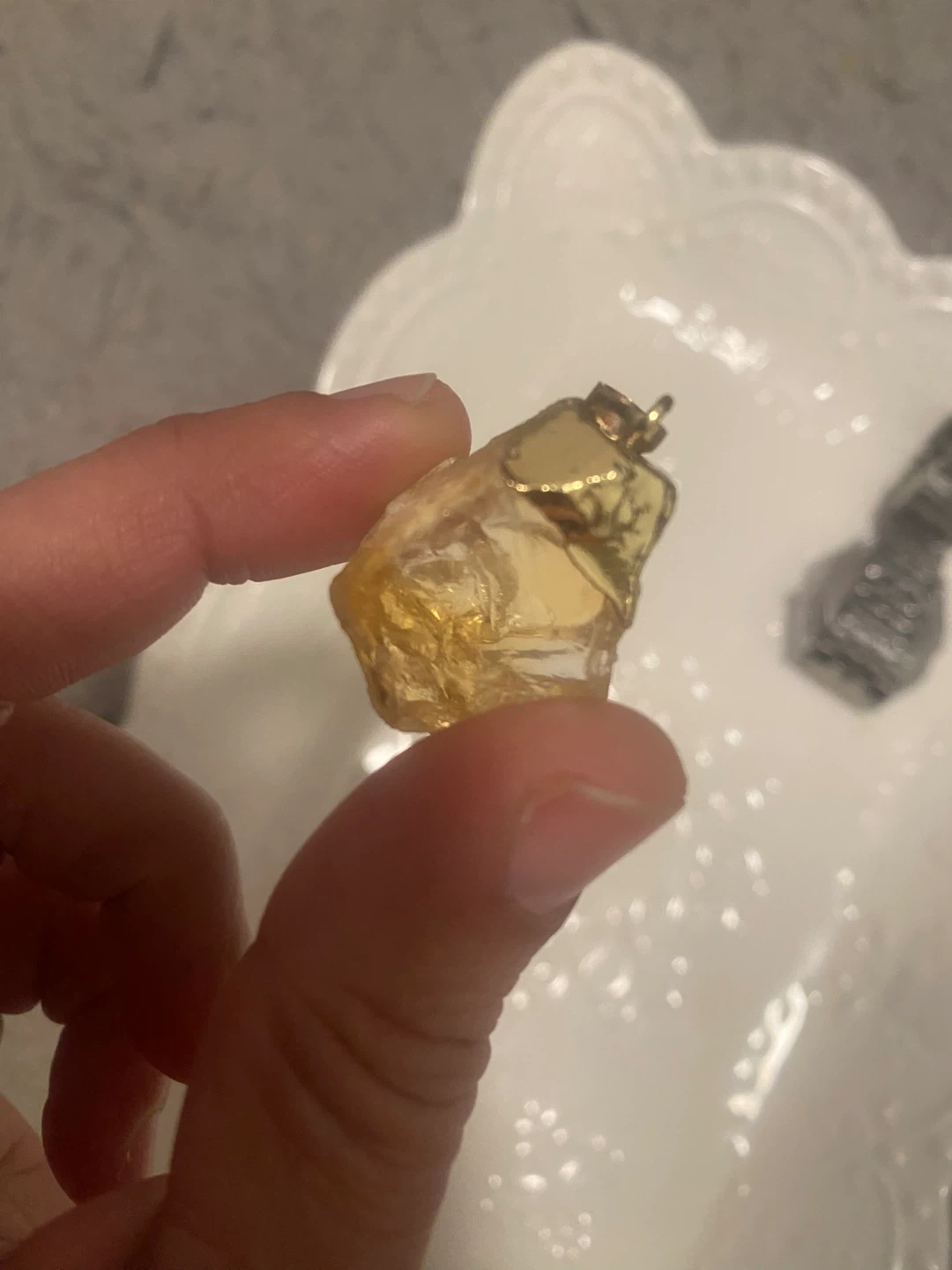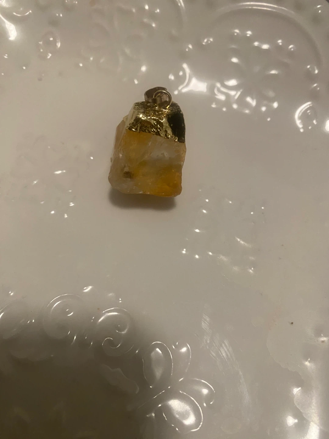 This is a beautiful, raw citrine pendant with a gold color bail. The stone is a lovely yellow colour and has a unique, natural shape. It's perfect for anyone who loves crystals or wants to add a touch of natural beauty to their look. The pendant is in used, but great condition.
