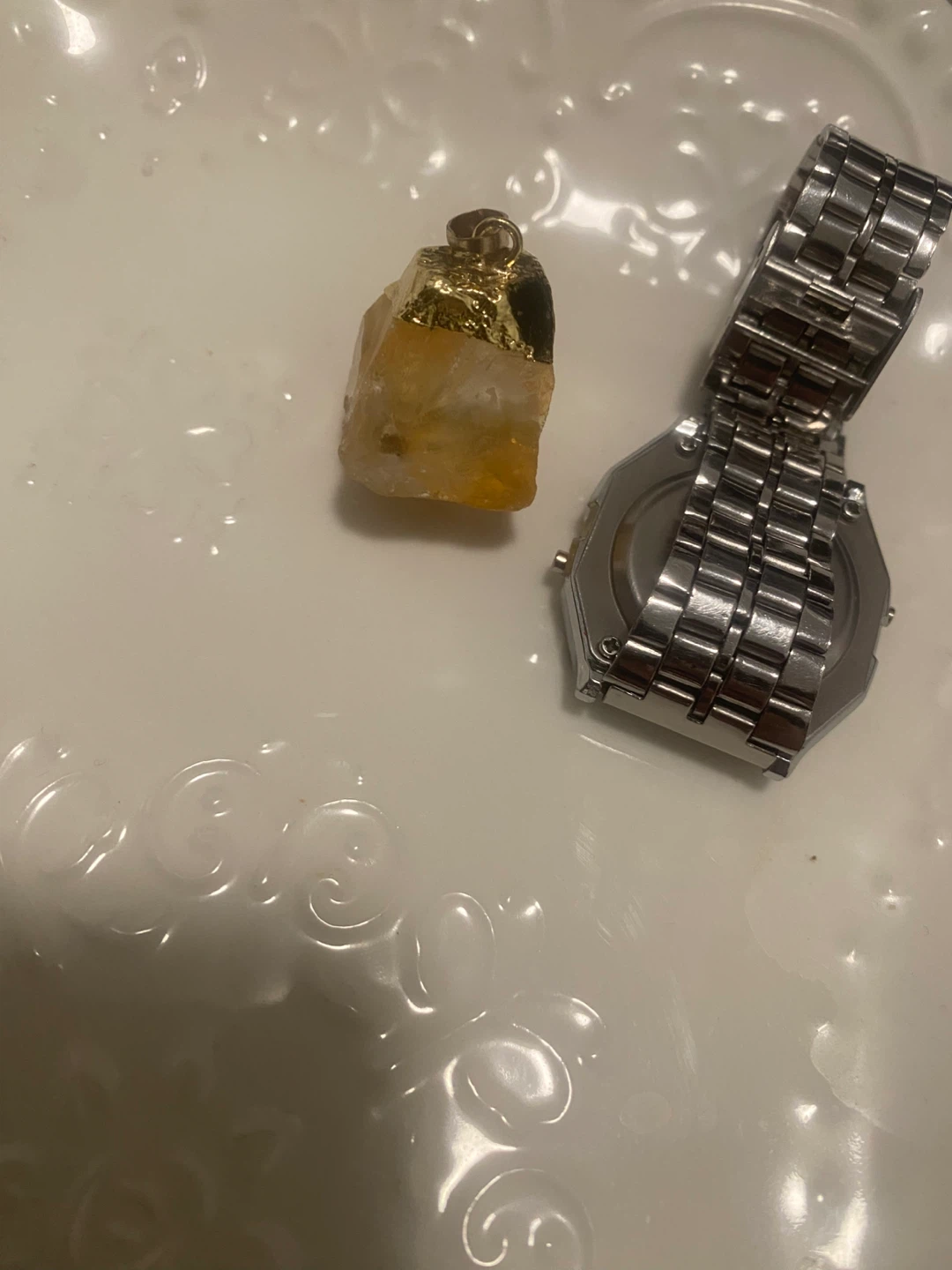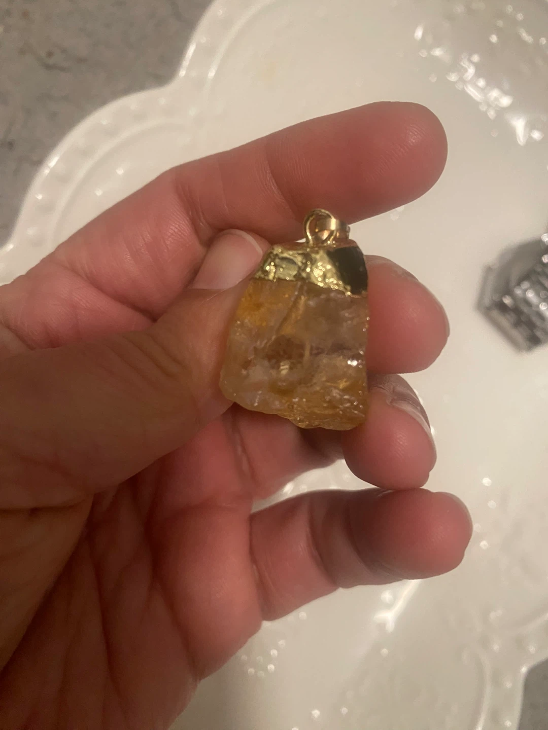 This is a beautiful, raw citrine pendant with a gold color bail. The stone is a lovely yellow colour and has a unique, natural shape. It's perfect for anyone who loves crystals or wants to add a touch of natural beauty to their look. The pendant is in used, but great condition.