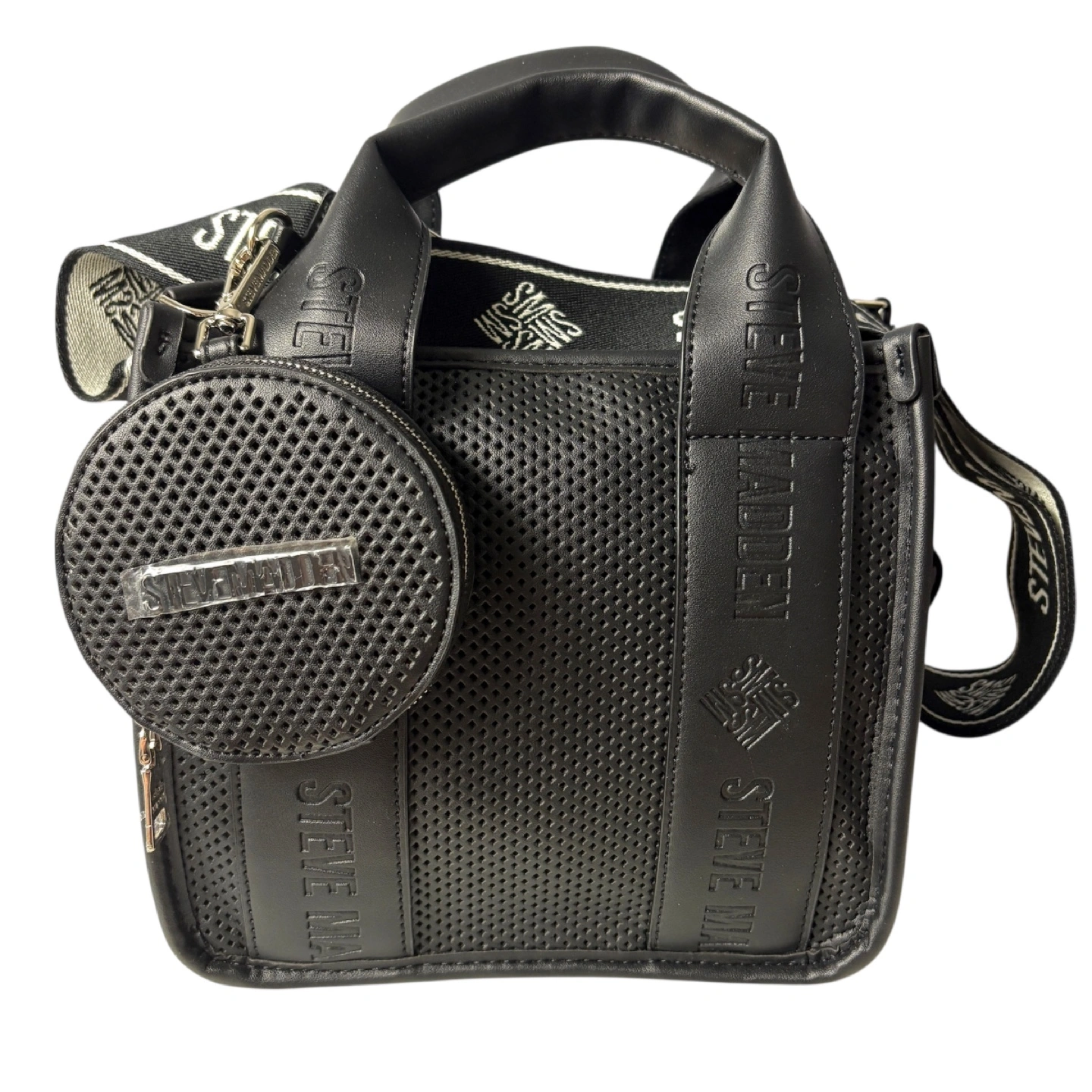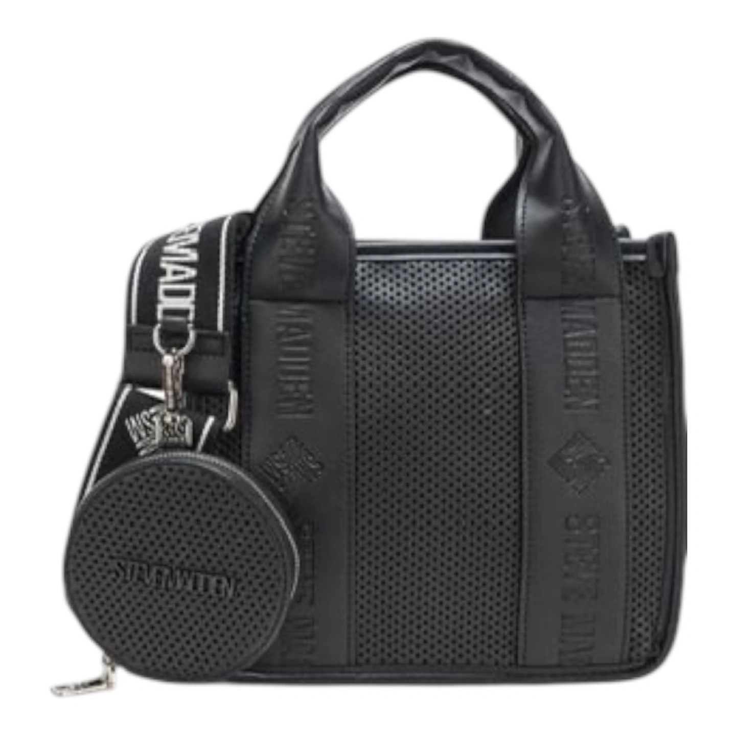 The Steve Madden BWEBBER Perforated Satchel is a must-have accessory that combines chic design with everyday practicality. Featuring a stylish perforated exterior, this satchel adds a modern edge to your look. The 3.5" drop handle provides easy carry, while the 23" adjustable shoulder and crossbody straps offer versatile wear options. An attachable round pouch adds extra functionality, and the magnetic snap closure ensures your belongings stay secure.