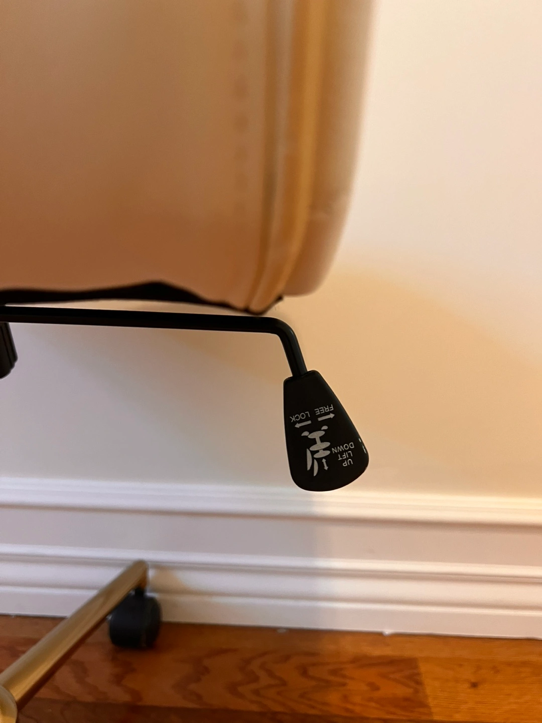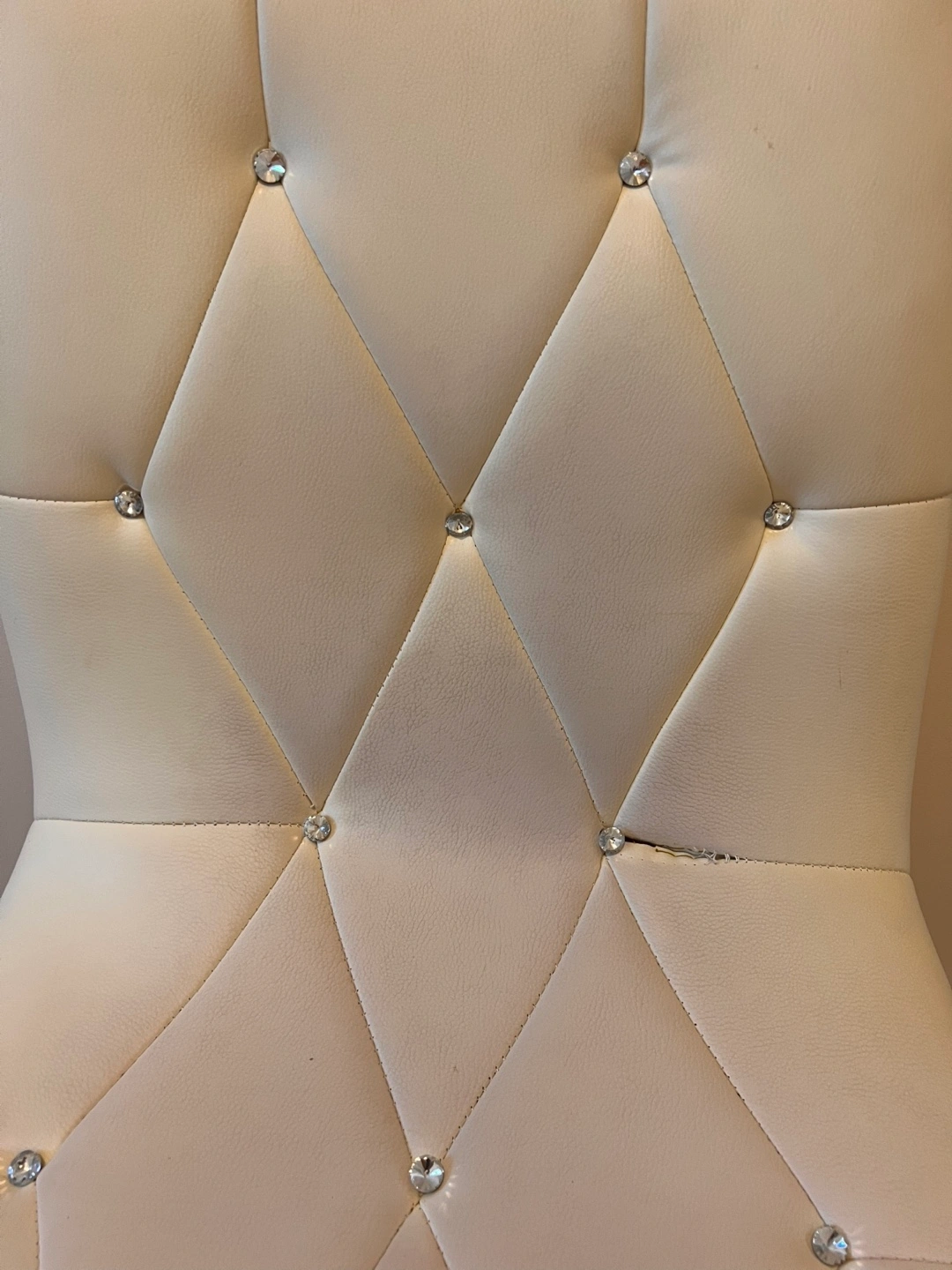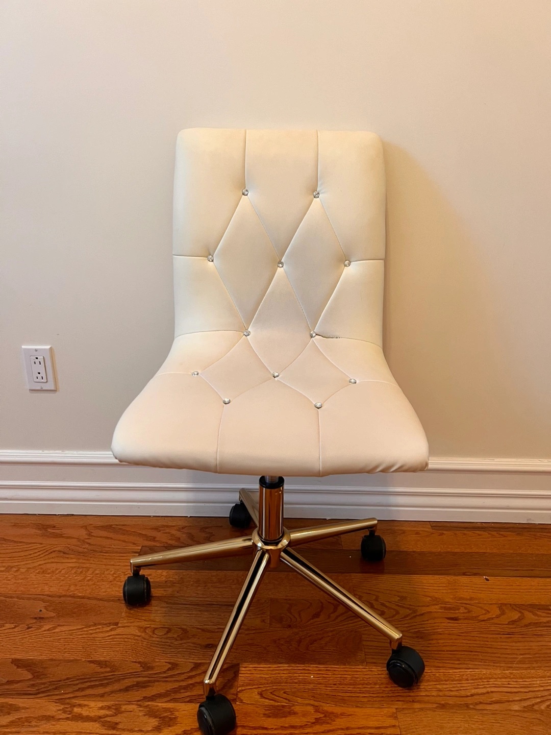 Off-white cushioned chair. Gold metal base and rolling casters. Height adjustable. Crystal accents on the backrest. Modern design. There is a break in one of the front seams and slight discoloration.