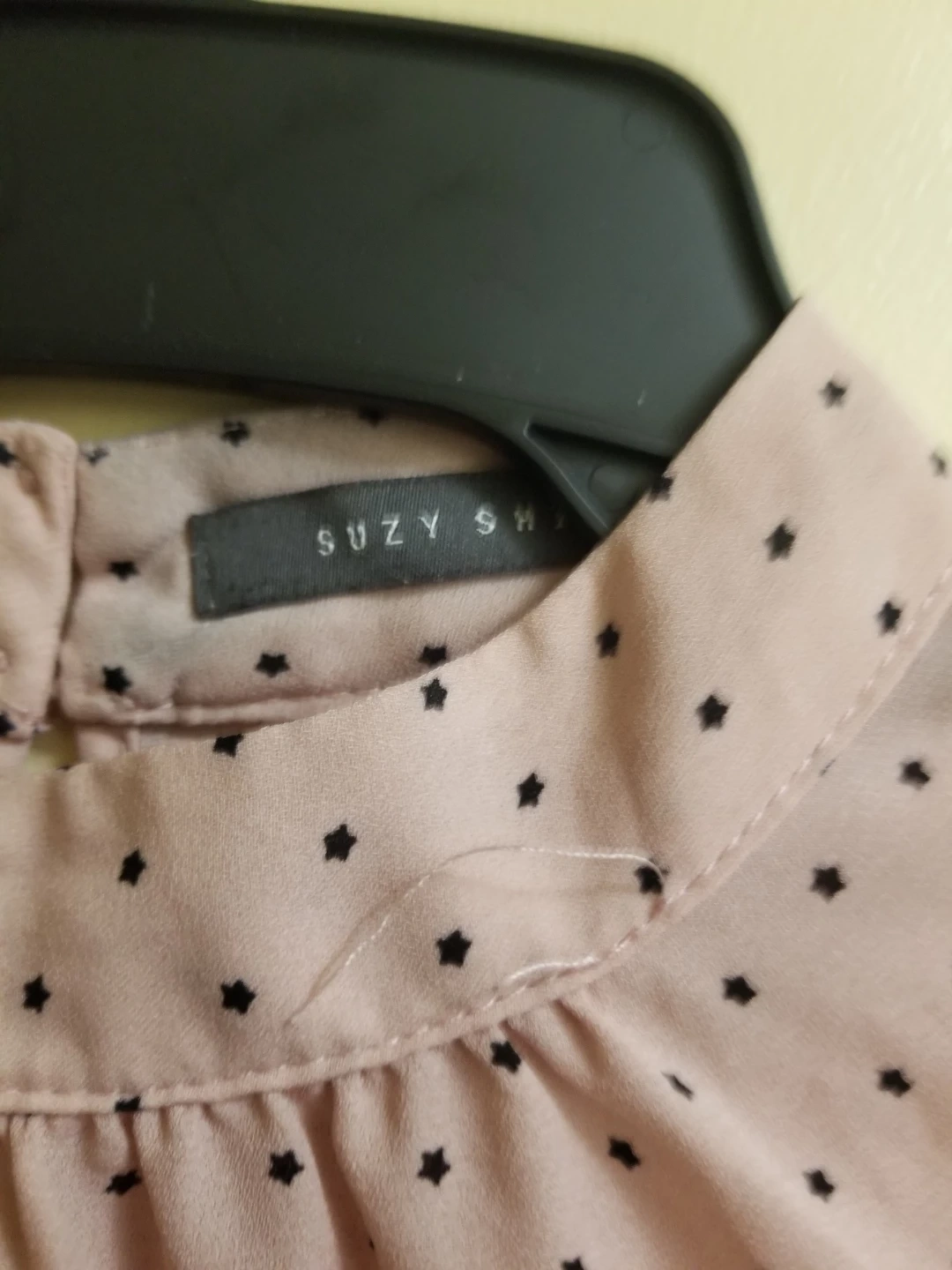 This Suzy Shier blouse is designed with a mock neck and features a lovely pink base with small black polka dots. It has bell-shaped ruffled sleeves and a gathered detail at the neckline. It's a stylish top for many occasions! XS