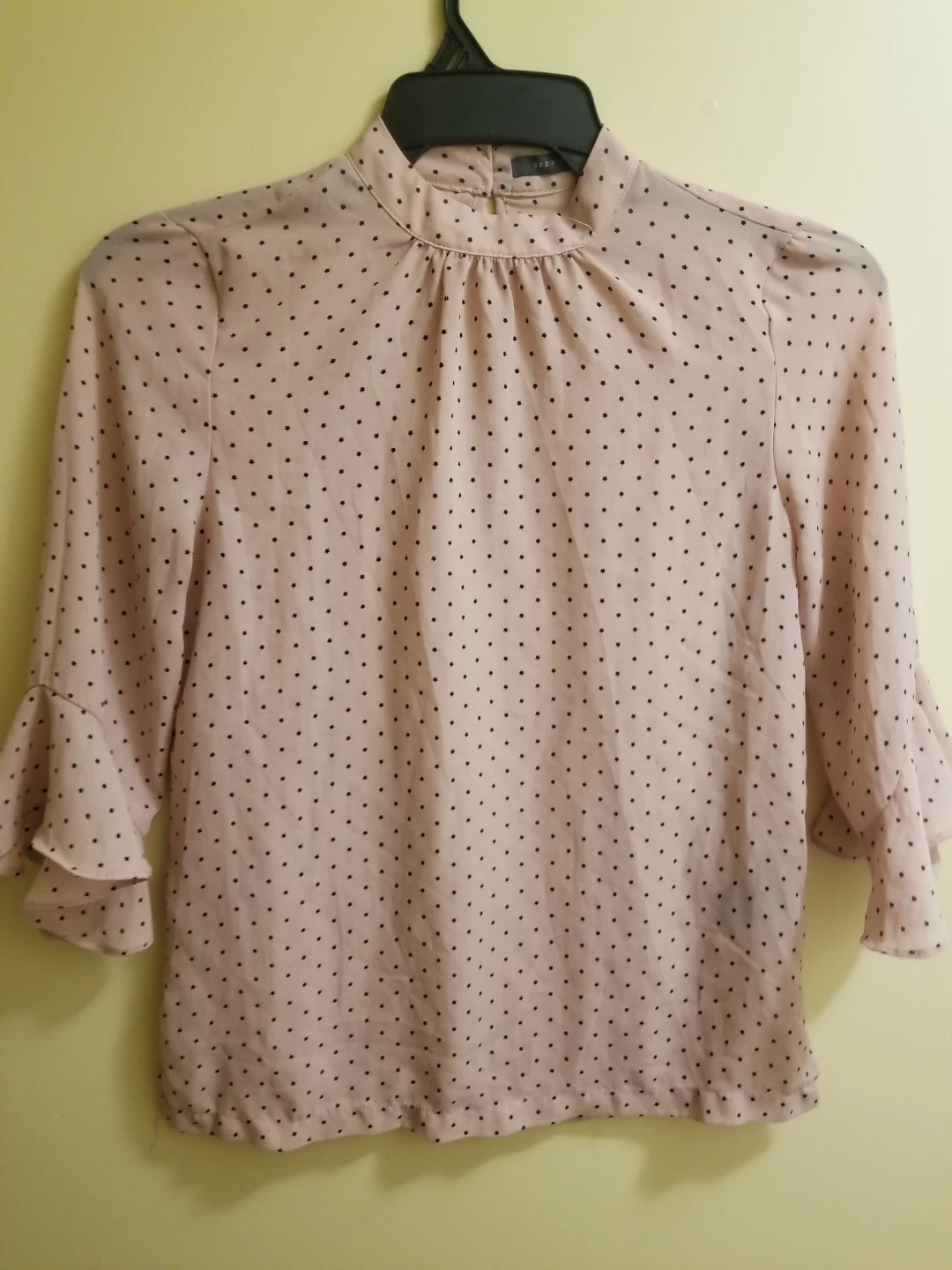 This Suzy Shier blouse is designed with a mock neck and features a lovely pink base with small black polka dots. It has bell-shaped ruffled sleeves and a gathered detail at the neckline. It's a stylish top for many occasions! XS