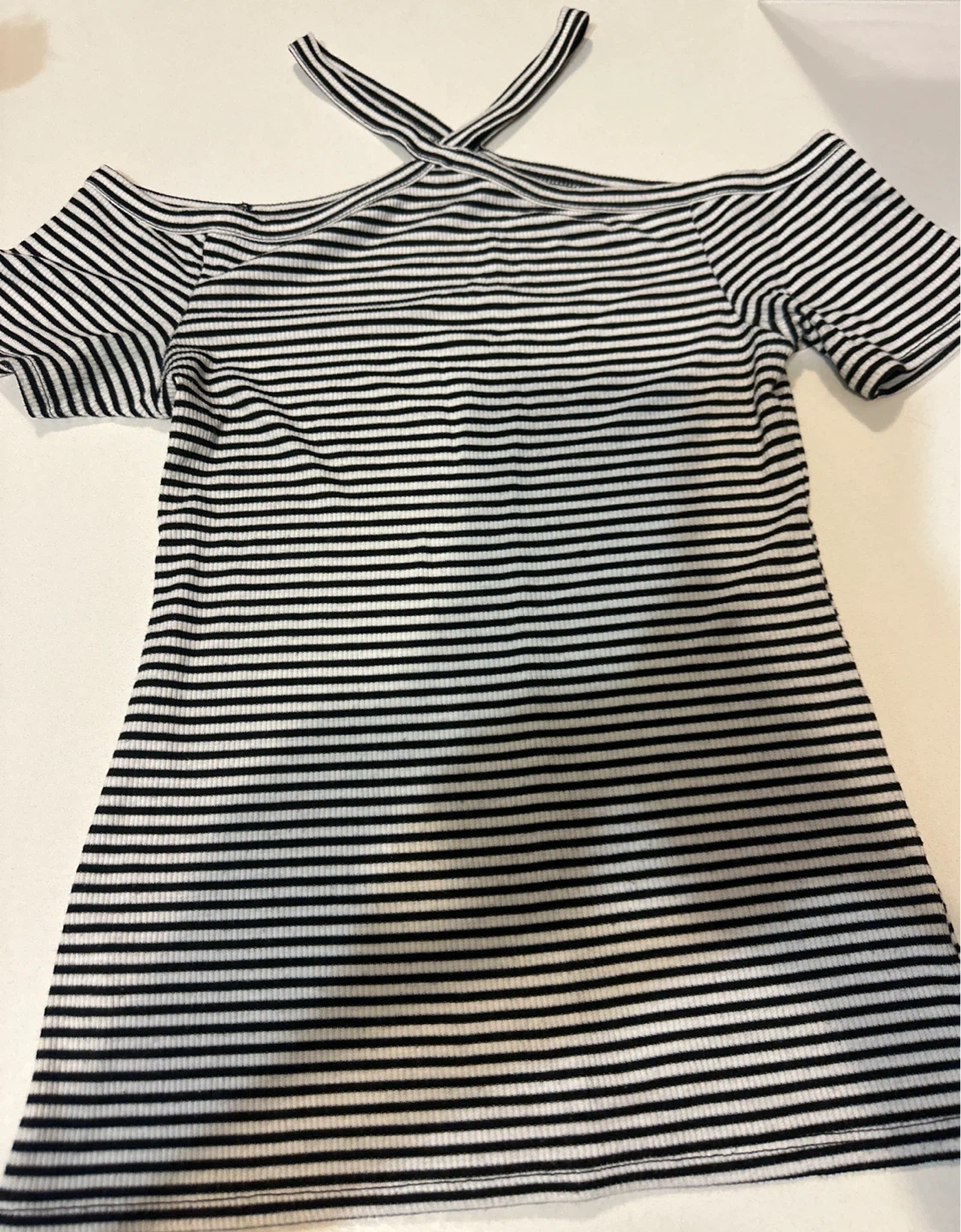 Ribbed black and white striped off-the-shoulder top. It has a flattering halter neckline with short sleeves. Material is a comfortable stretch knit.