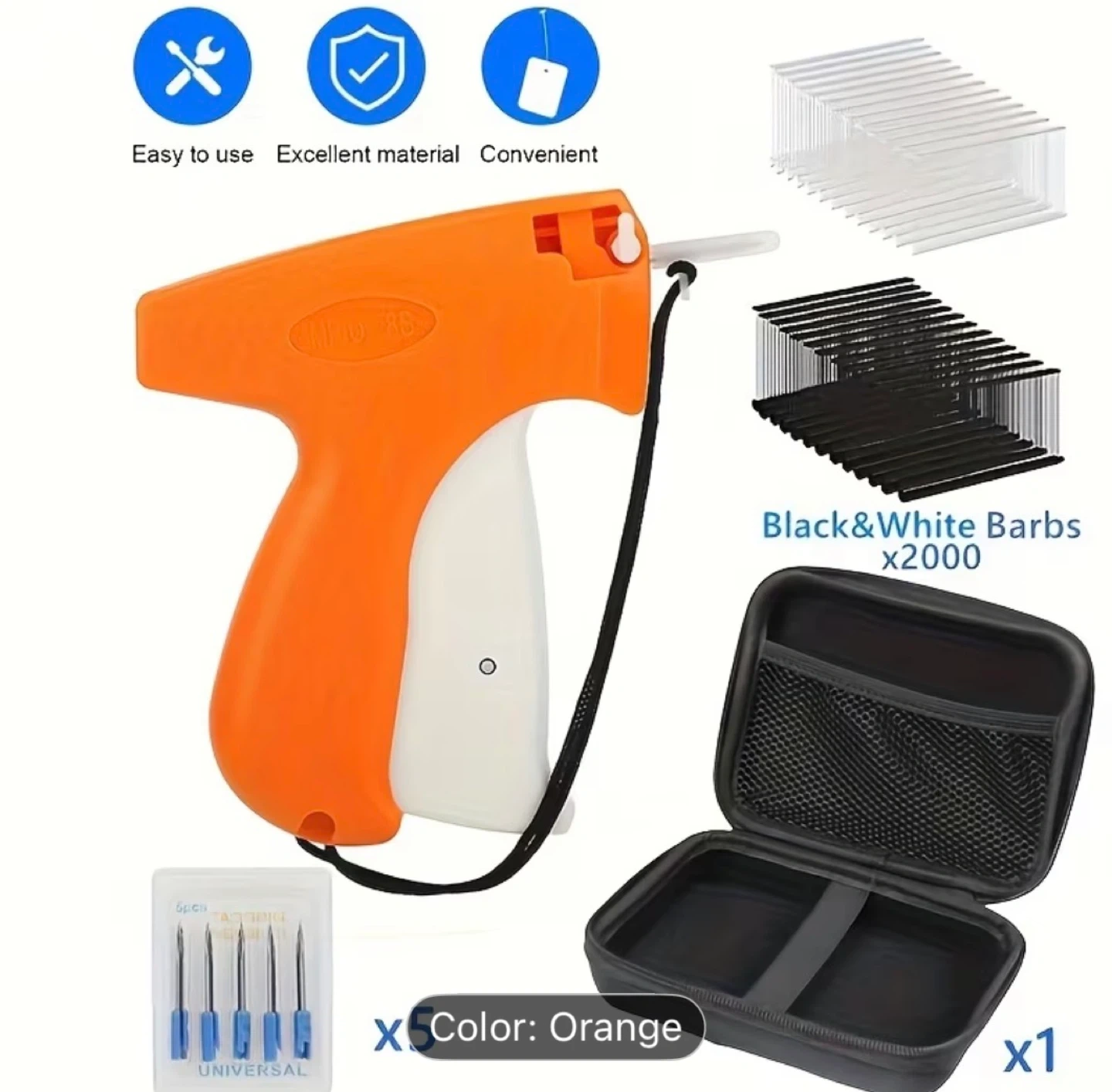 This set includes an orange clothing tagging gun with a stainless steel needle. It comes with 2000 black and white barbs and a convenient carrying case. The gun is made from durable ABS hard plastic.