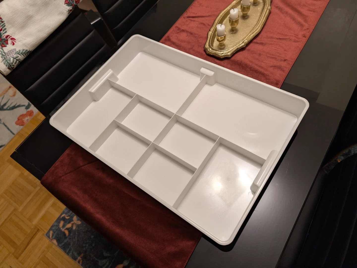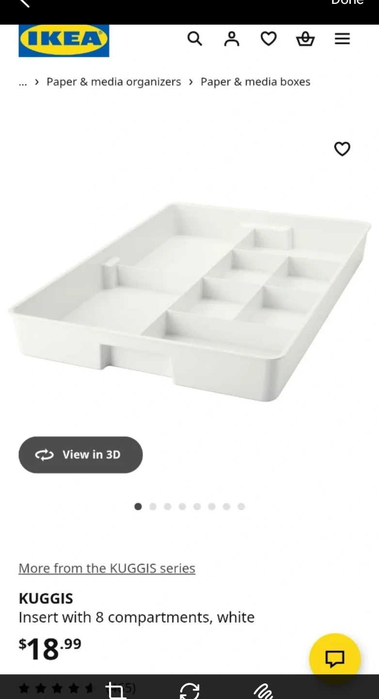 This is a white IKEA KUGGIS insert with 8 compartments. It's designed for organizing various items like drug or messy drawers. Purchased for $18.99 + tax