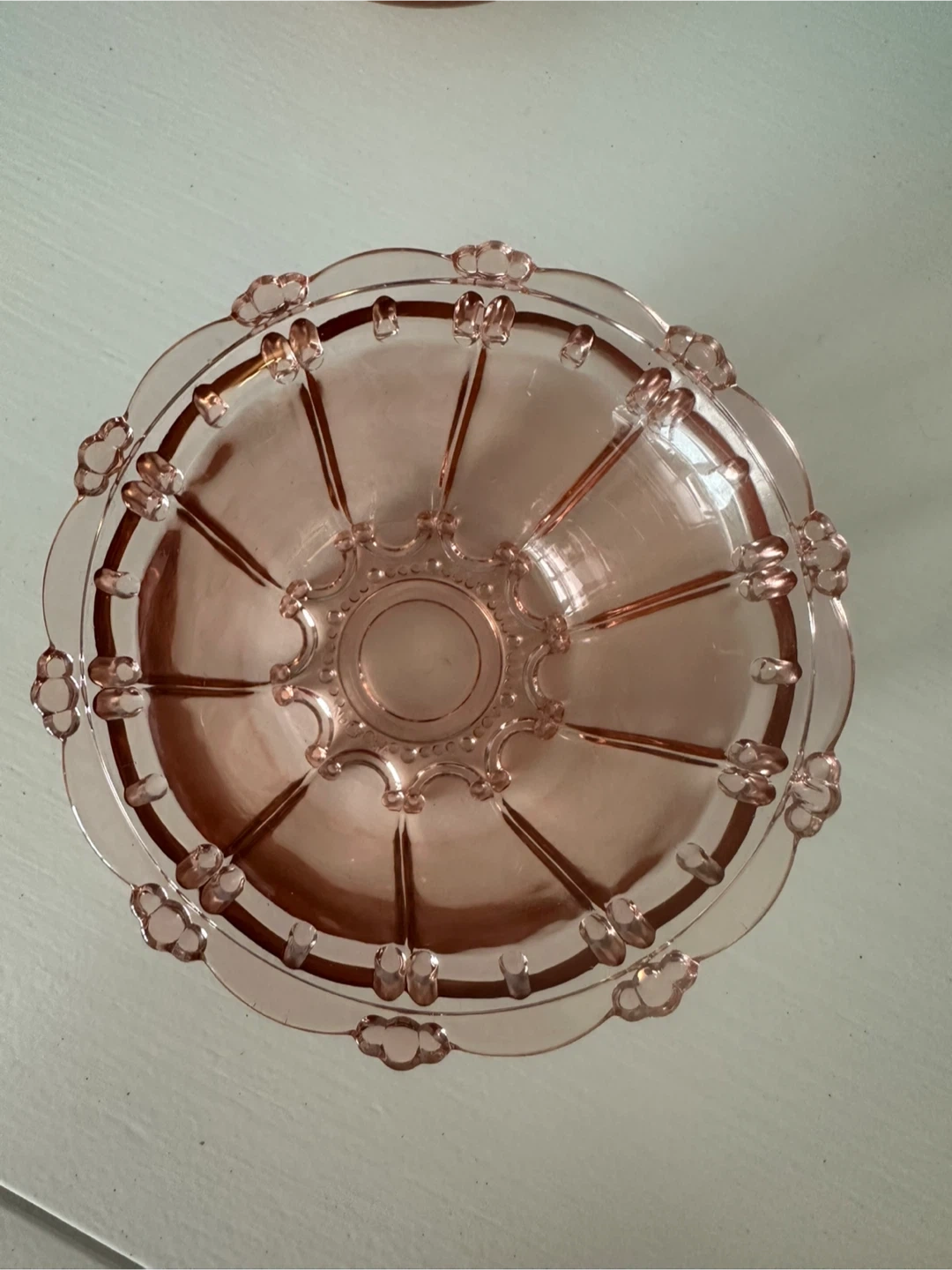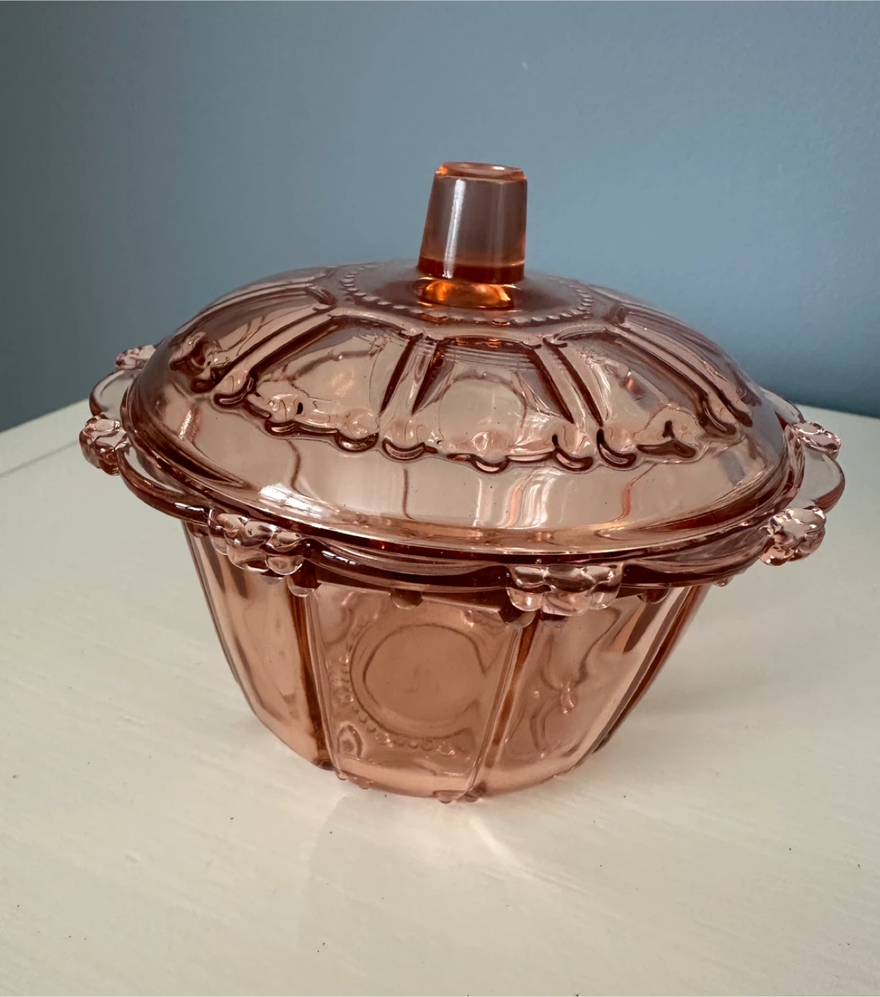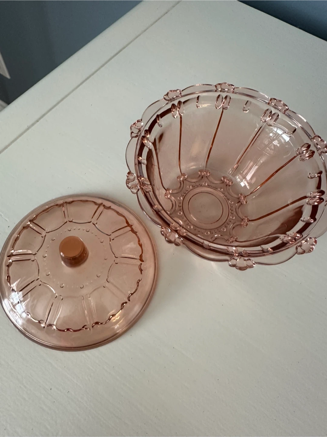 This particular pink covered candy dish has a detailed ribbed pattern and scalloped edges. It has the KIG Indonesia mark. It is from the mid-20th century. It measures 5” wide and approximately 4” tall. Don’t miss out on this beautiful piece! Pick up Windsor Park, cross posted.