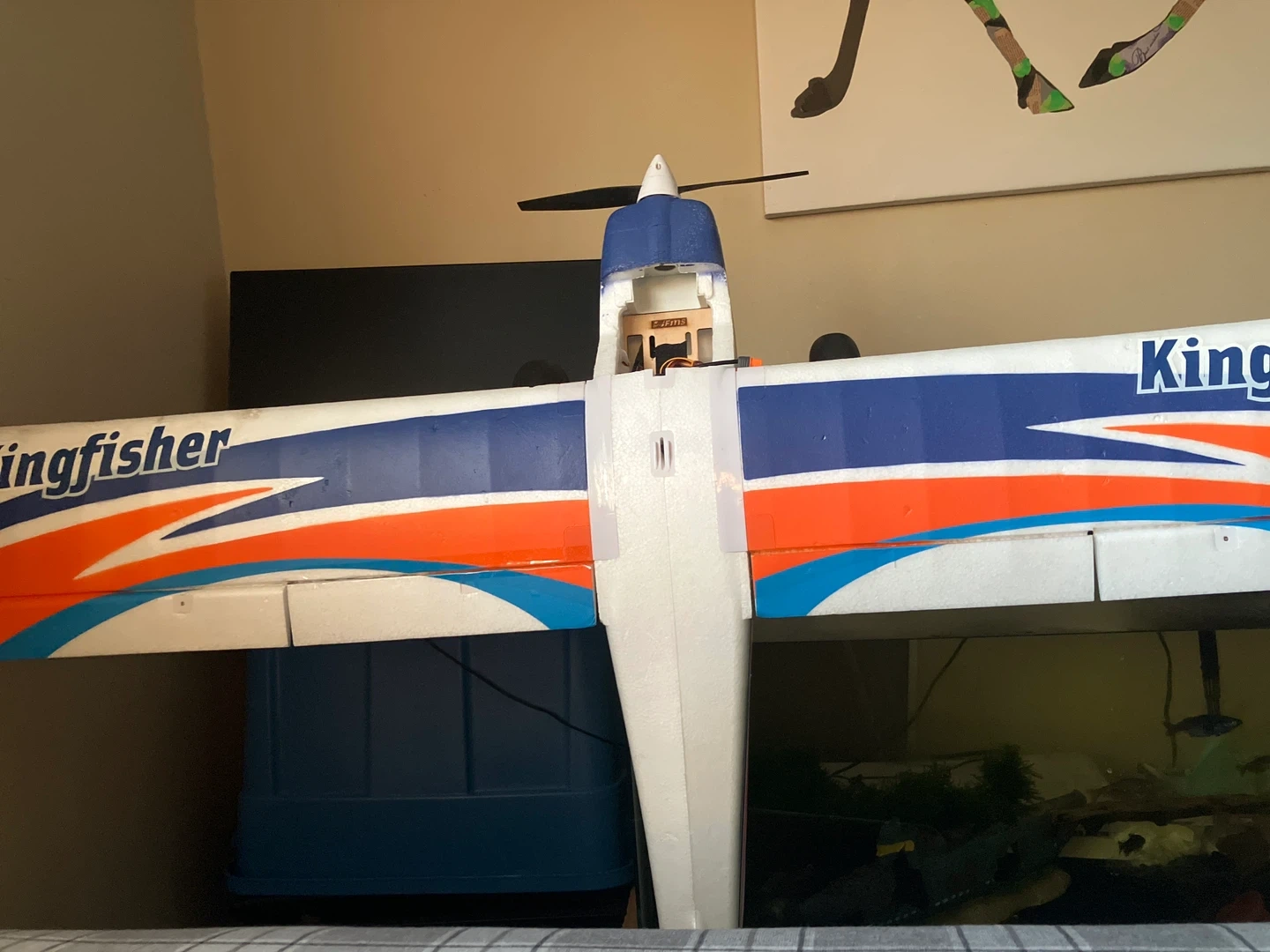 This is a Kingfisher remote control airplane. It has a white base with blue and orange racing stripes. It appears to be a foam model.