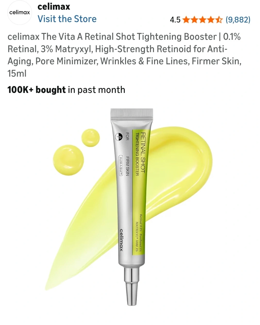 This Celimax Retinal Shot Tightening Booster contains 0.1% Retinal and 3% Matryxyl. It's formulated for anti-aging, pore minimizing, and reducing wrinkles. The bottle is 15ml.
