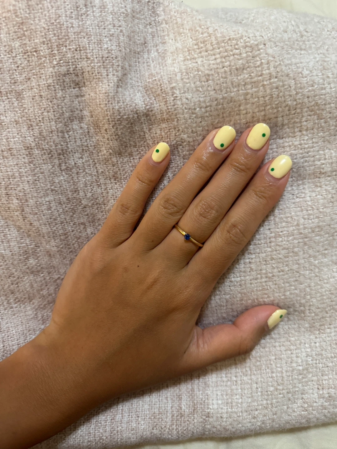 A dainty gold ring featuring a single small blue stone. It's perfect for adding a subtle touch of elegance to any outfit. The minimalist design makes it a versatile piece for everyday wear.