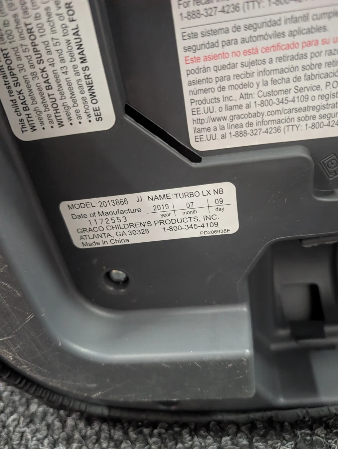This Graco TurboBooster LX NB booster car seat is designed for children 40-100 lbs. It features a built-in cup holder and adjustable armrests. Made in China. Model 2013866. Date of Manufacture: 2019 September 07.