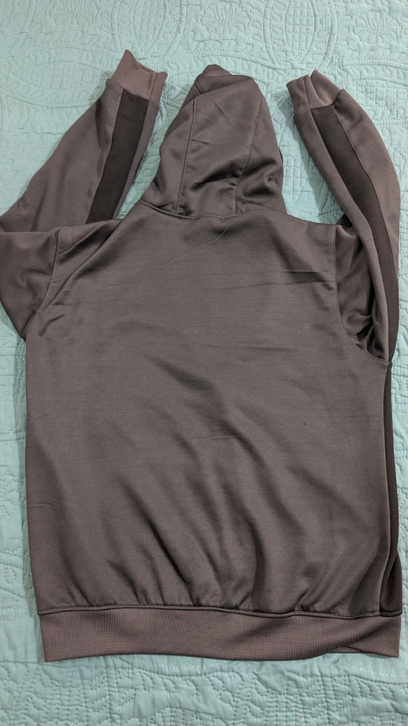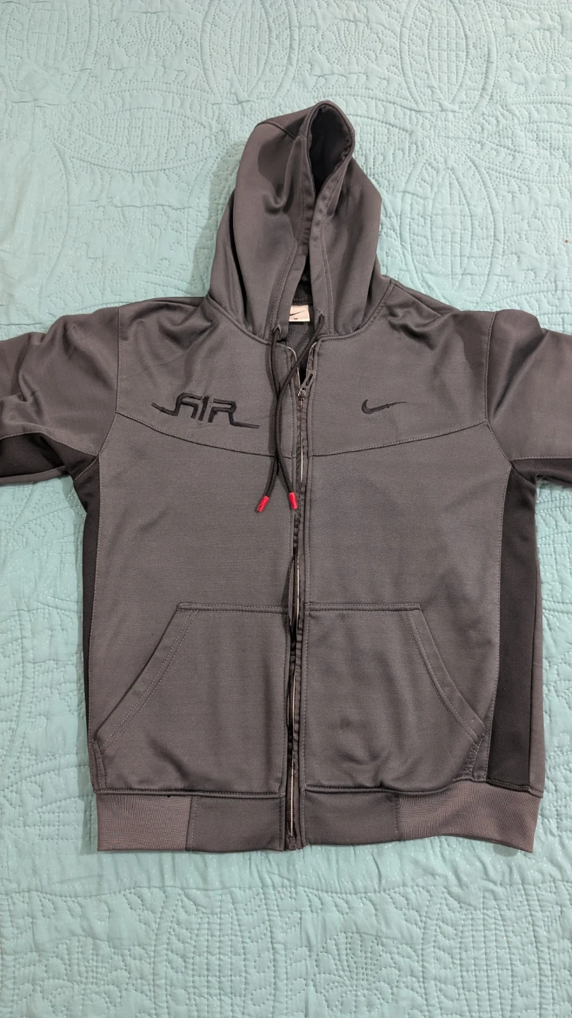 This is a grey Nike Air full zip hoodie. It's made of a polyester blend with contrasting black side panels. Features a drawstring hood and front pockets.