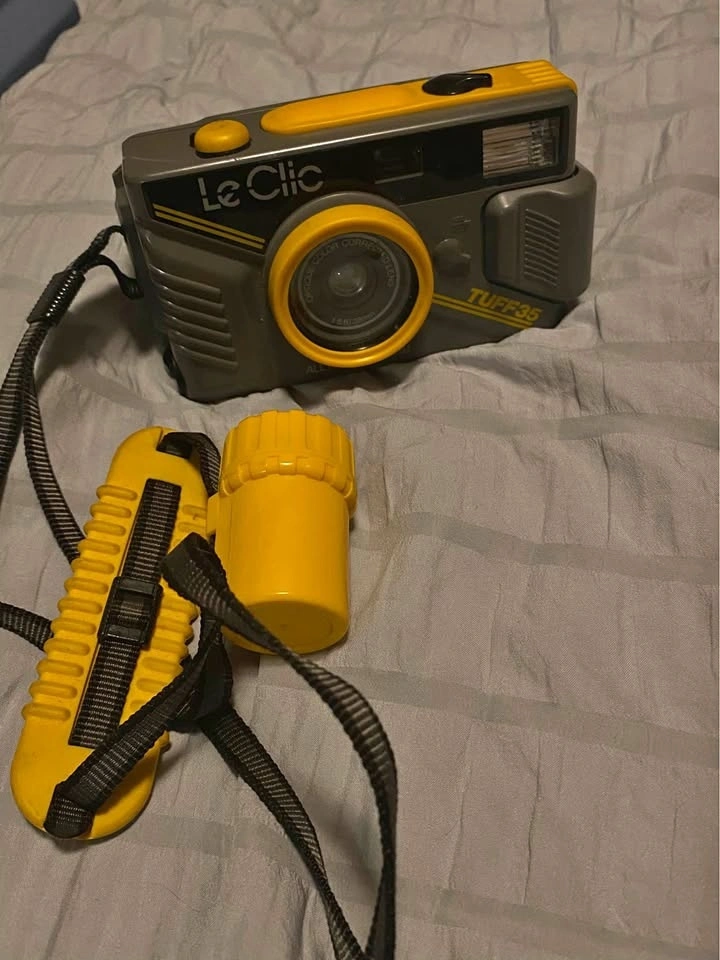 This is a Le Clic Tuff 35 all-weather 35mm point-and-shoot film camera. It features a fixed 38mm f/5.6 lens and a built-in flash. The camera has a single shutter speed of 1/125s and automatic film winding. It is weather-sealed for use in rain and inclement weather, but not underwater. It requires two AA batteries to operate. Needs to be cleaned. Pick up and cash only, in Penticton.