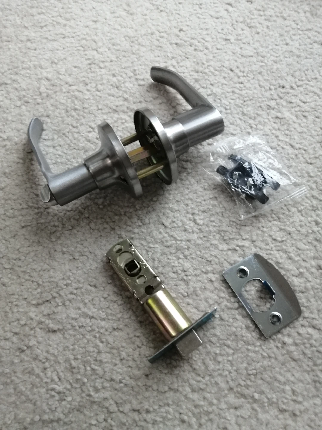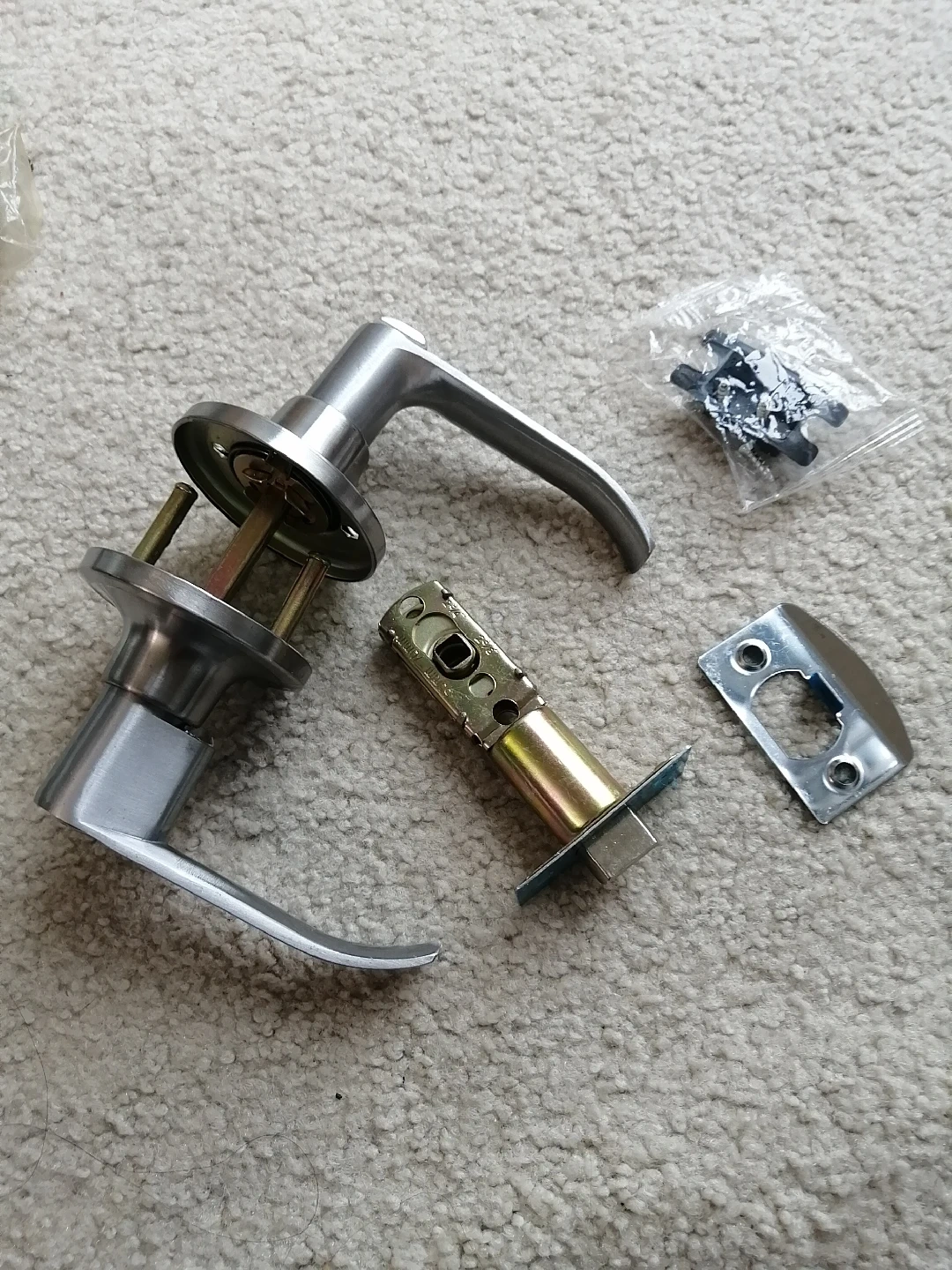 Selling a door handle set in silver. Includes the handle, latch, strike plate, and screws. Perfect for replacing an old or broken handle!