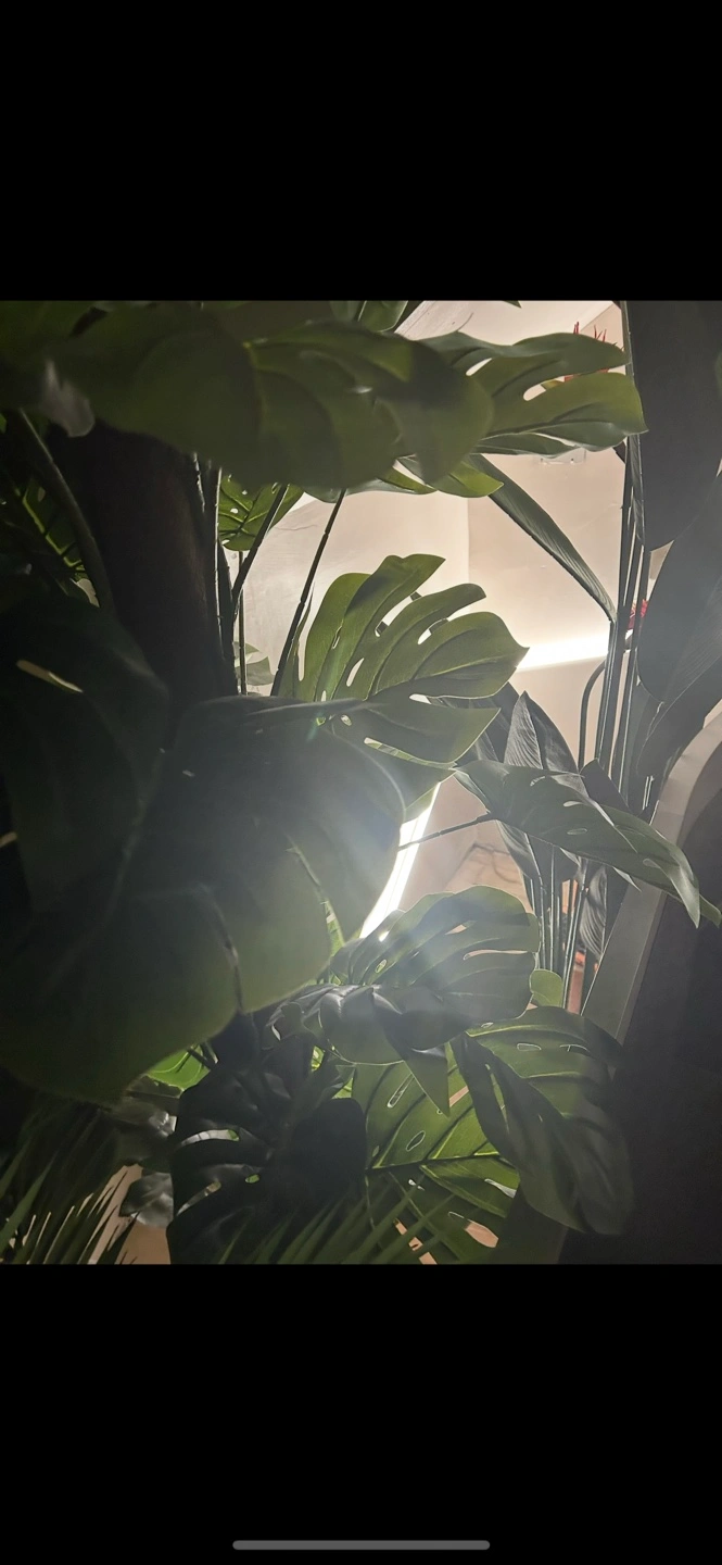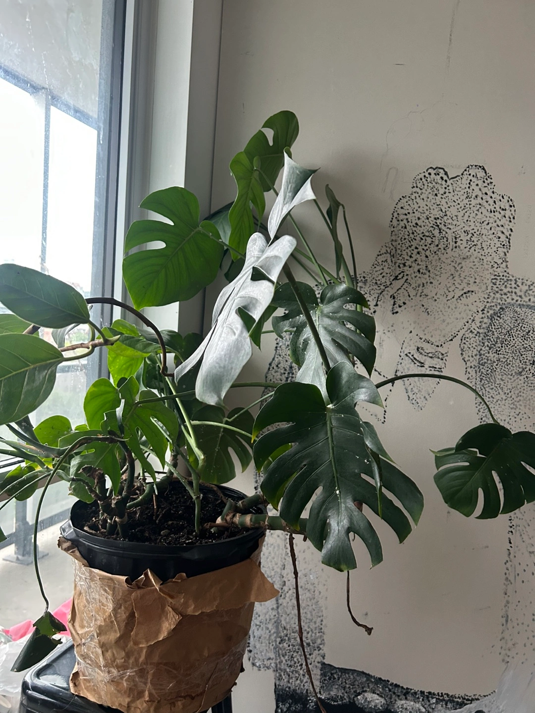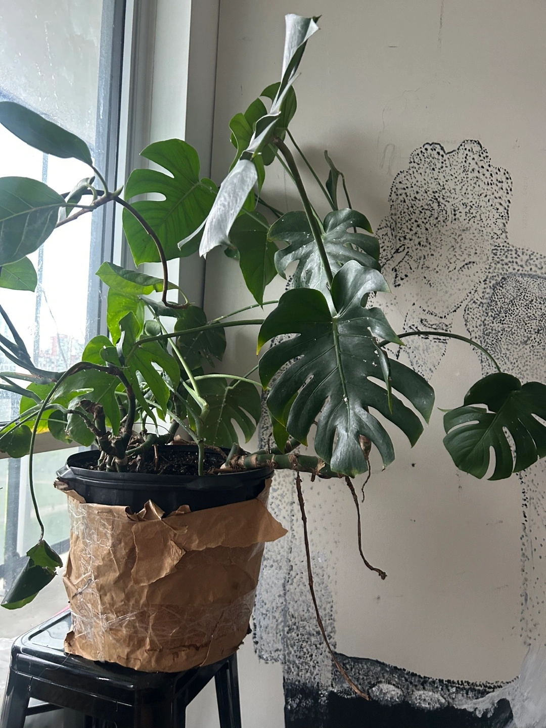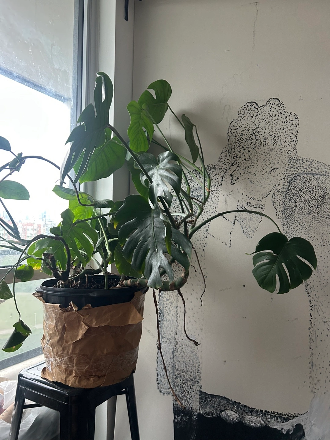 Healthy Monstera deliciosa in a pot. Several large leaves. Growing well.