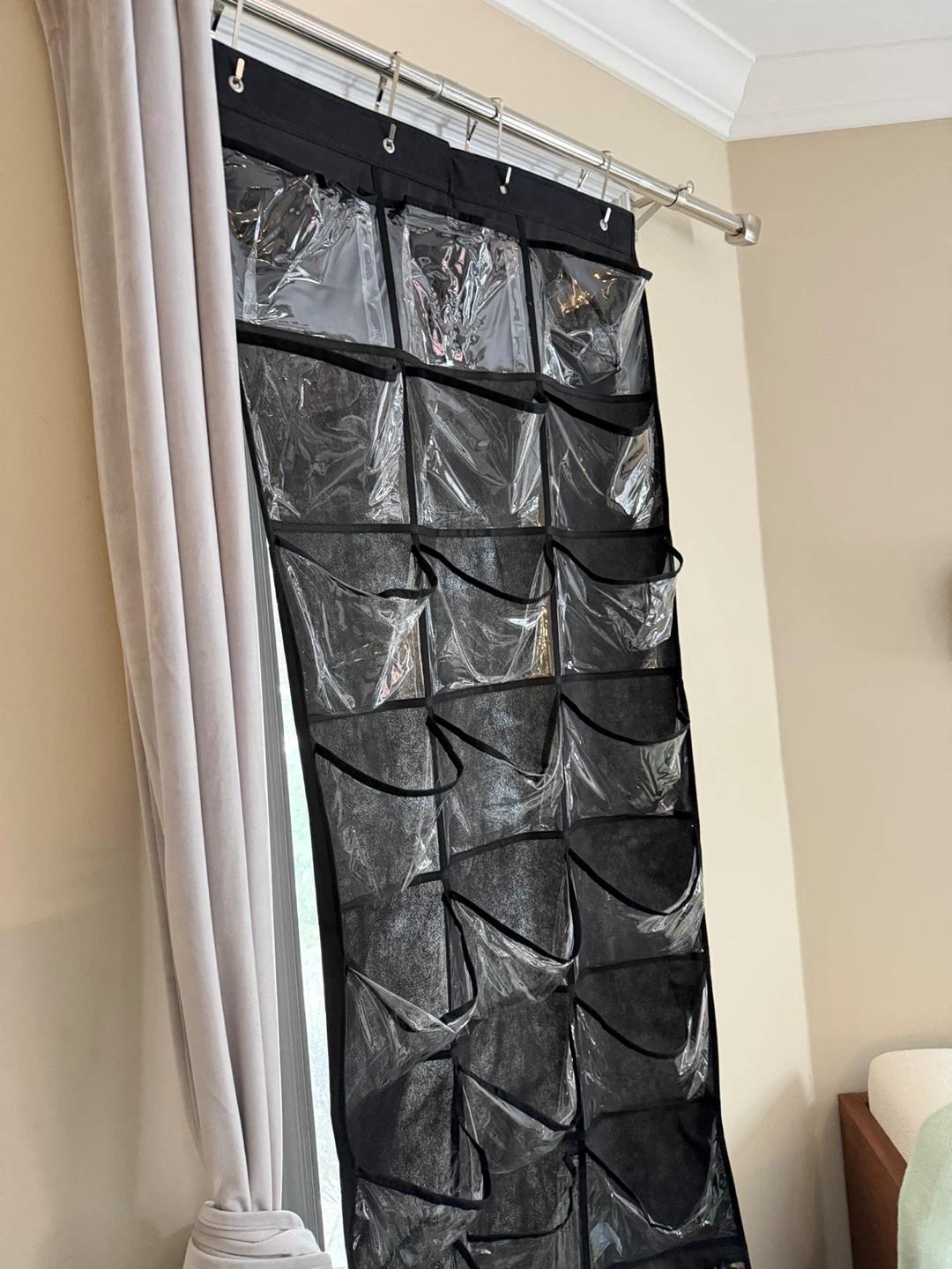 This over-the-door hanging organizer is black with 24 clear pockets for storage. It's perfect for shoes, accessories, or small items. Easy to hang on any door!