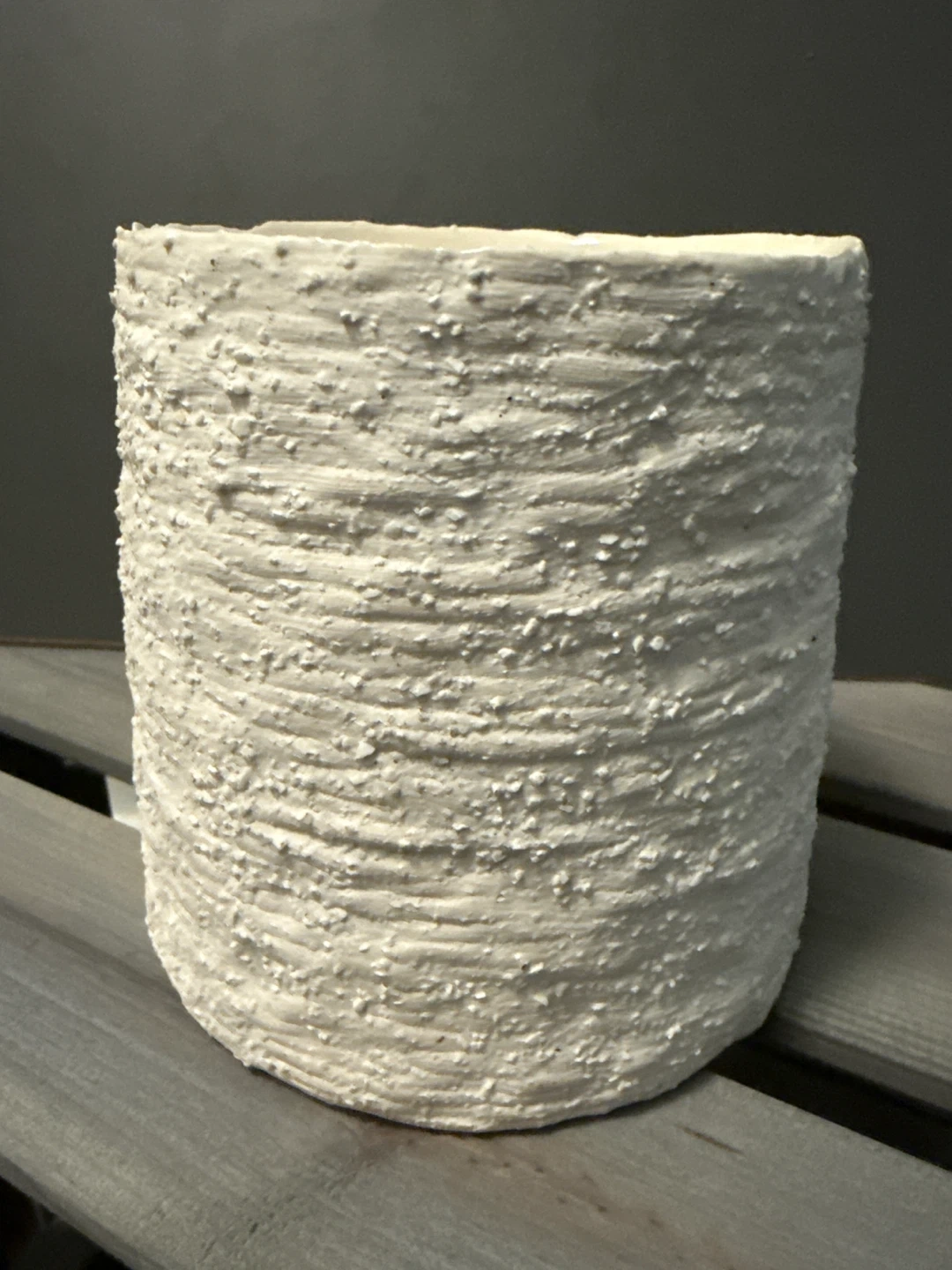 This is a textured cream ceramic pot. It has a unique, raised circular pattern all around the exterior. This pot's neutral color and interesting texture make it a versatile decorative piece.