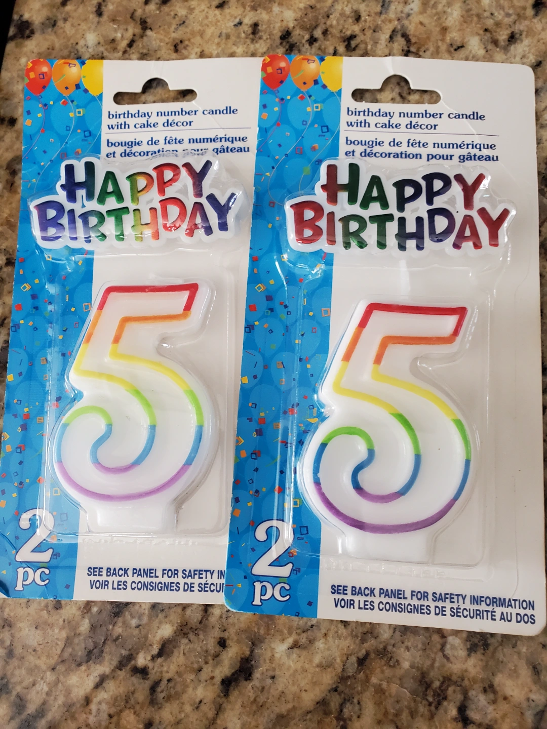 Two rainbow-coloured number 5 candles. Perfect for birthday cakes. Pick up only near St Clair and Victoria Park.