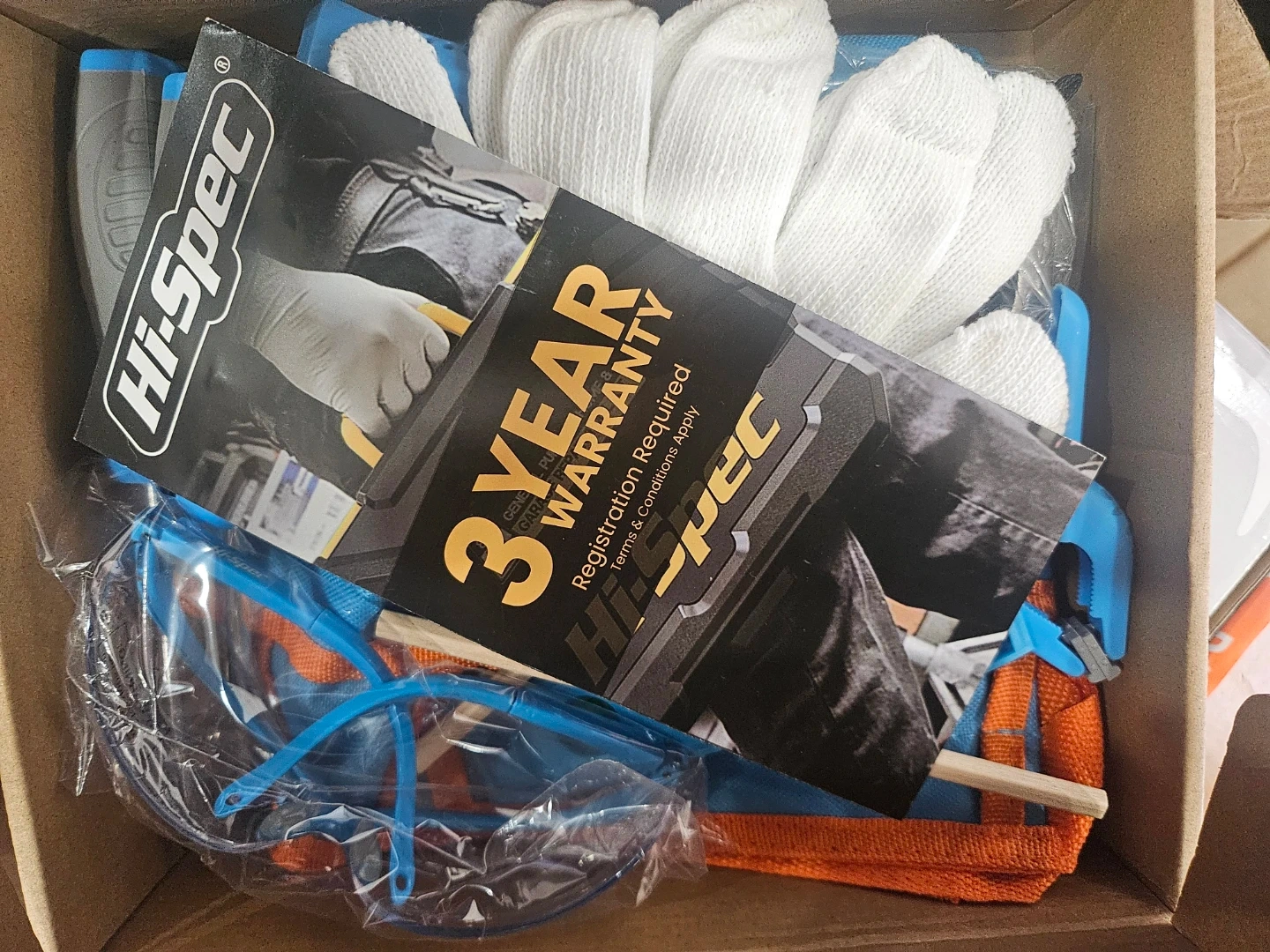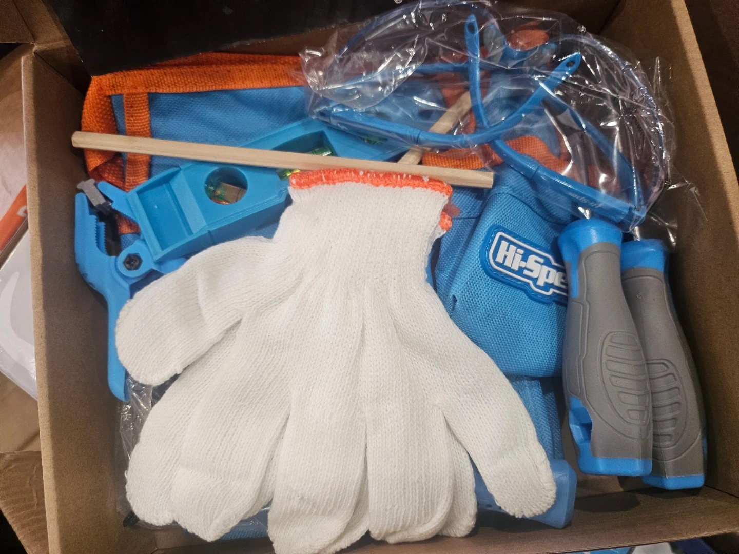 This is a Hi-Spec 16pc blue kids tool kit with real tools and a tool belt. It includes a pair of gloves and a tape measure. It's designed for children's DIY building and woodworking projects.