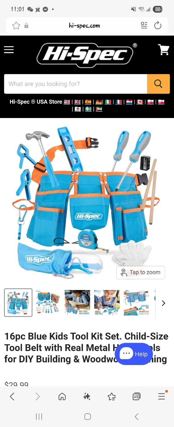 This is a Hi-Spec 16pc blue kids tool kit with real tools and a tool belt. It includes a pair of gloves and a tape measure. It's designed for children's DIY building and woodworking projects.