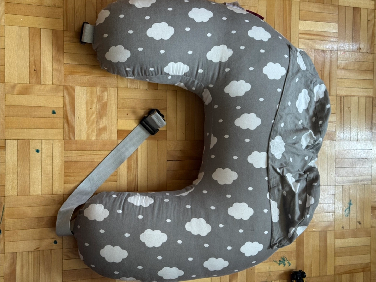 comfy nursing pillow with a cute grey and white cloud print! It has an adjustable strap to help you and baby get in the perfect position for feeding has a saddle addition for those sleepless sleepy night🫩🫩😴