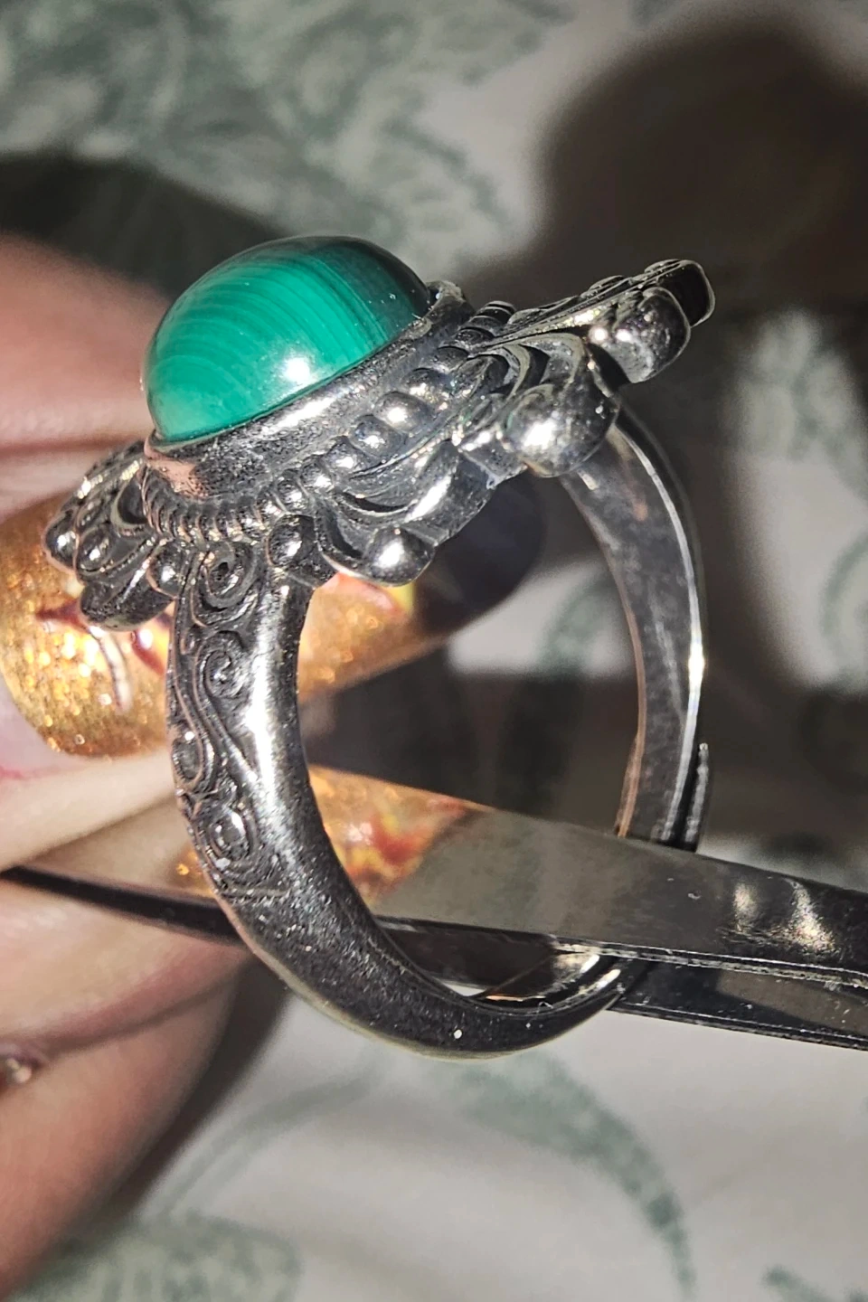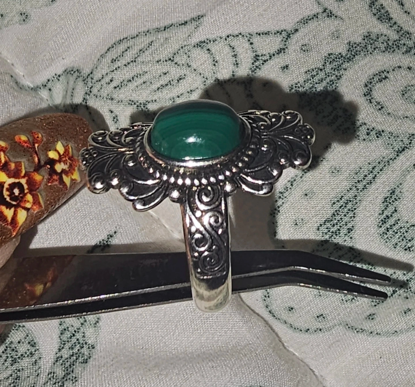 Selling a beautiful copper ring featuring a malachite stone! It has a lovely ornate/ vintage design. Would make a great addition to any jewelry collection. Malachite crystals are believed to absorb negative energy, promote transformation. open the heart, and stimulate imagination.