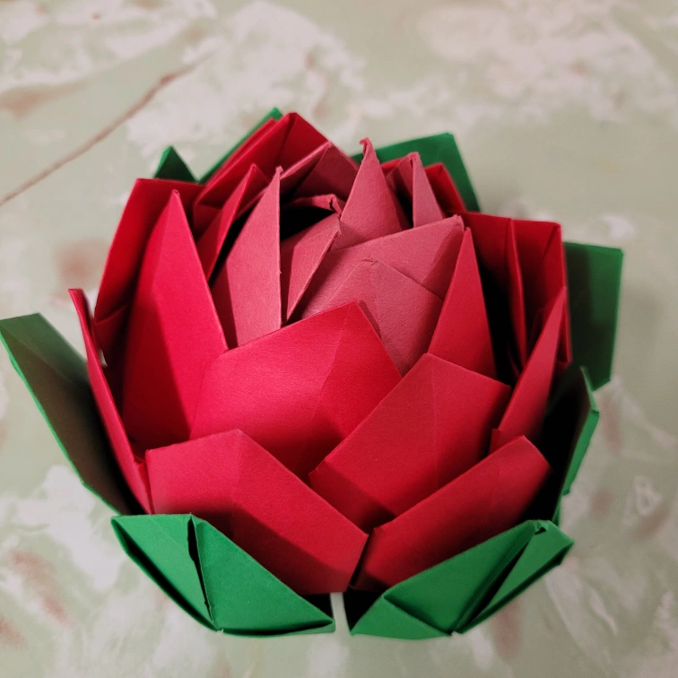 Beautiful origami lotus flower. Red petals and green leaves. Intricate folds. Unique paper craft. Decorative centerpiece.
