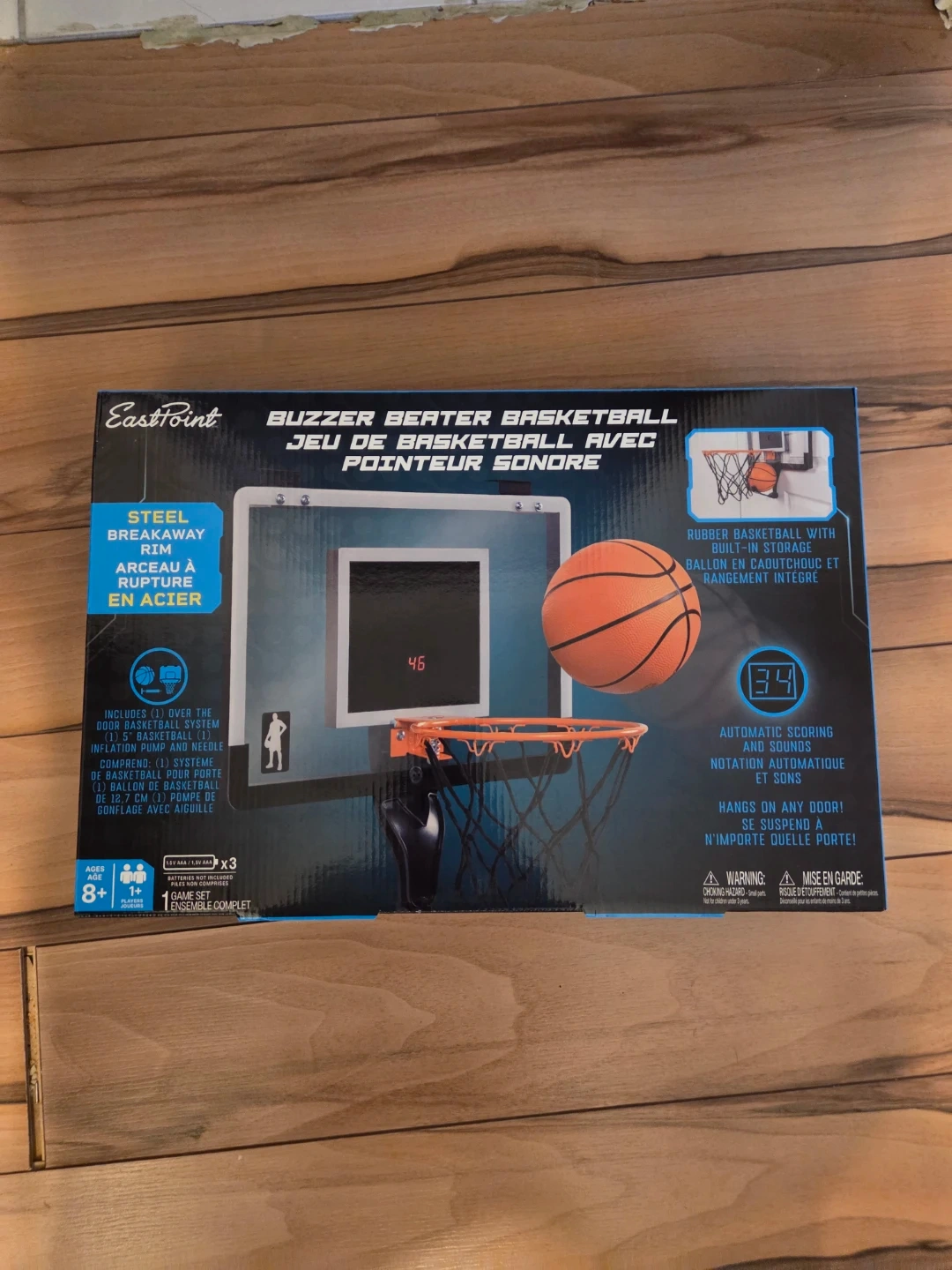 This over-the-door basketball system comes with a 5" rubber basketball and an inflation pump. It features automatic scoring and sounds and a steel breakaway rim. The set hangs on any door and is suitable for ages 8+.