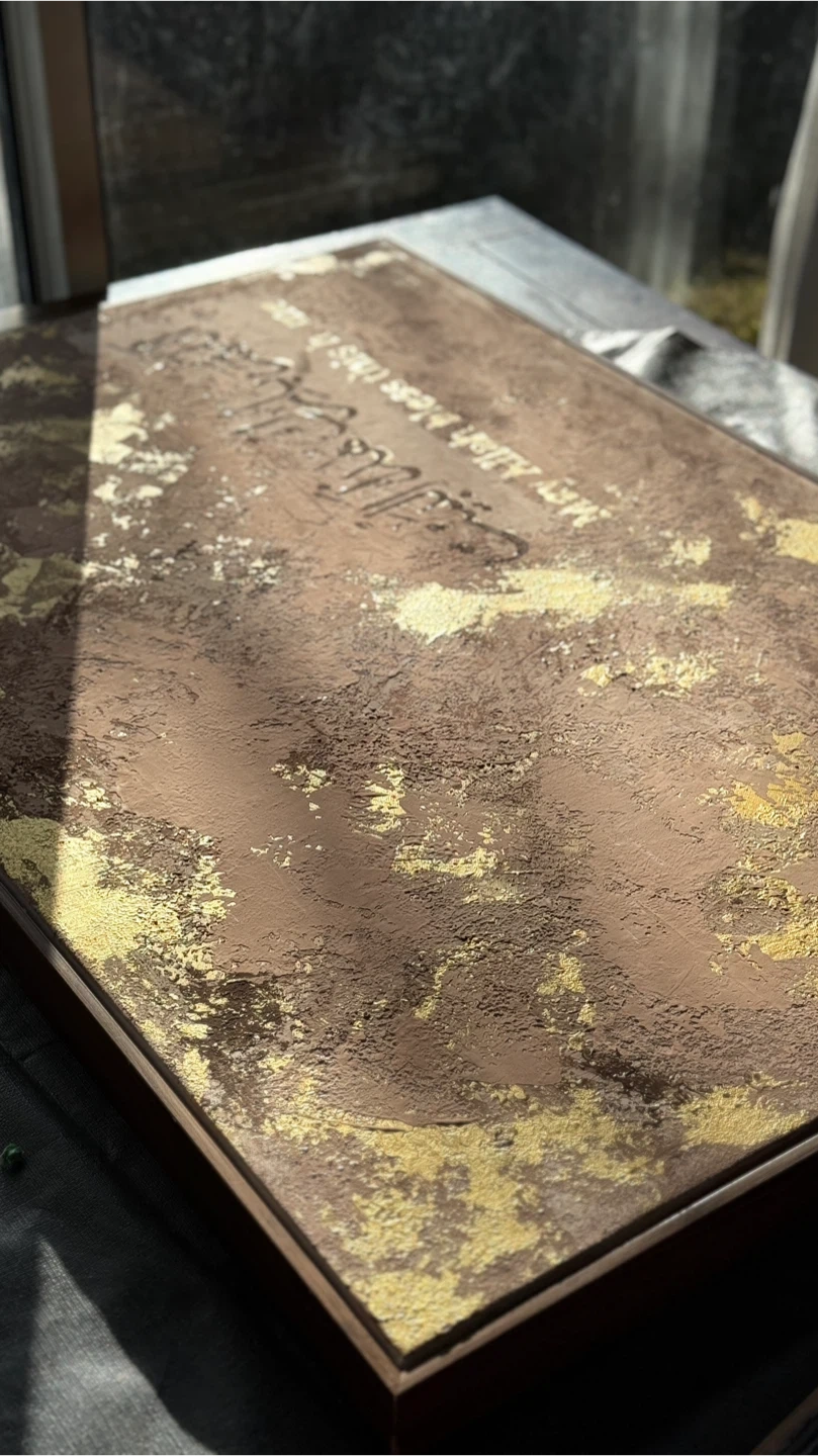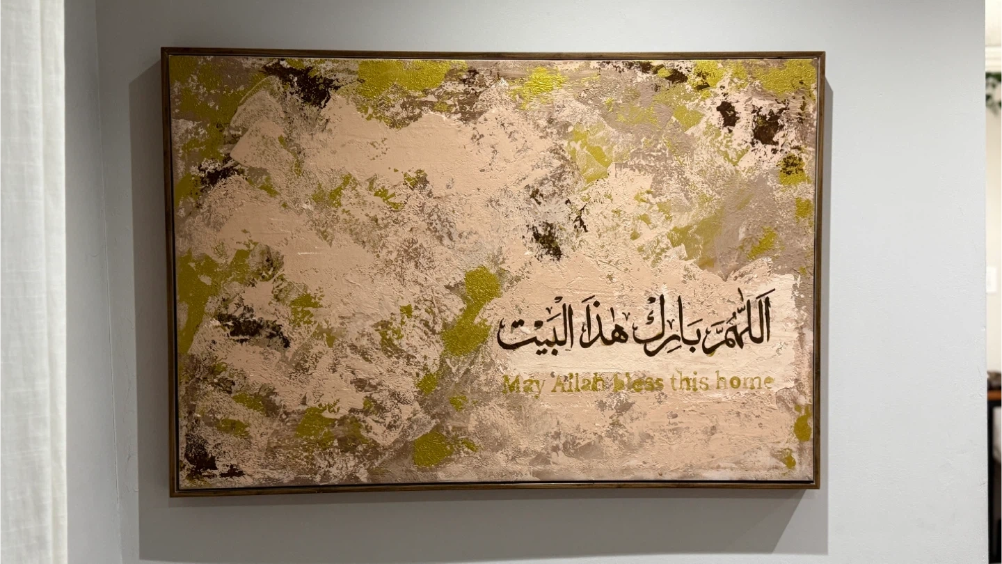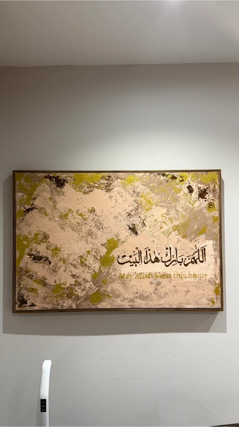 Beautiful textured framed art with Arabic calligraphy and English translation. Reads 'May Allah bless this home'. Features a mix of beige, gold, and brown abstract textures. It's a lovely piece to add to your living space.
