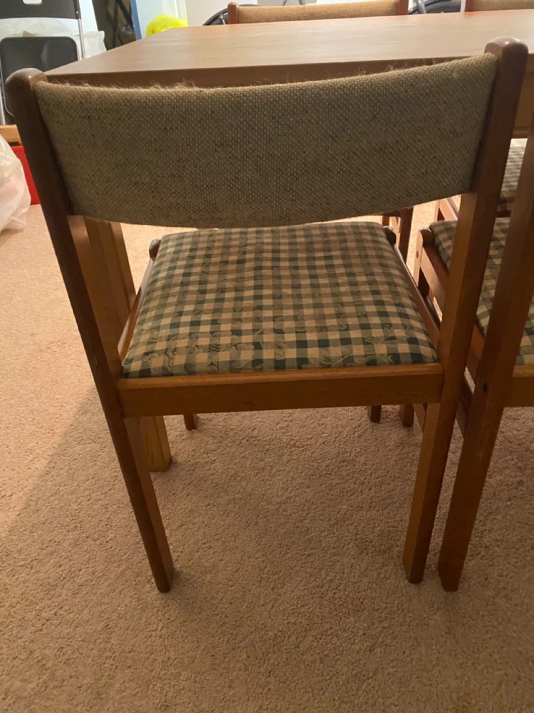 A natural wood dining table with four matching chairs. Chairs have a green and white checkered pattern on the seat and light-coloured fabric backs. Perfect for smaller dining spaces or kitchens!