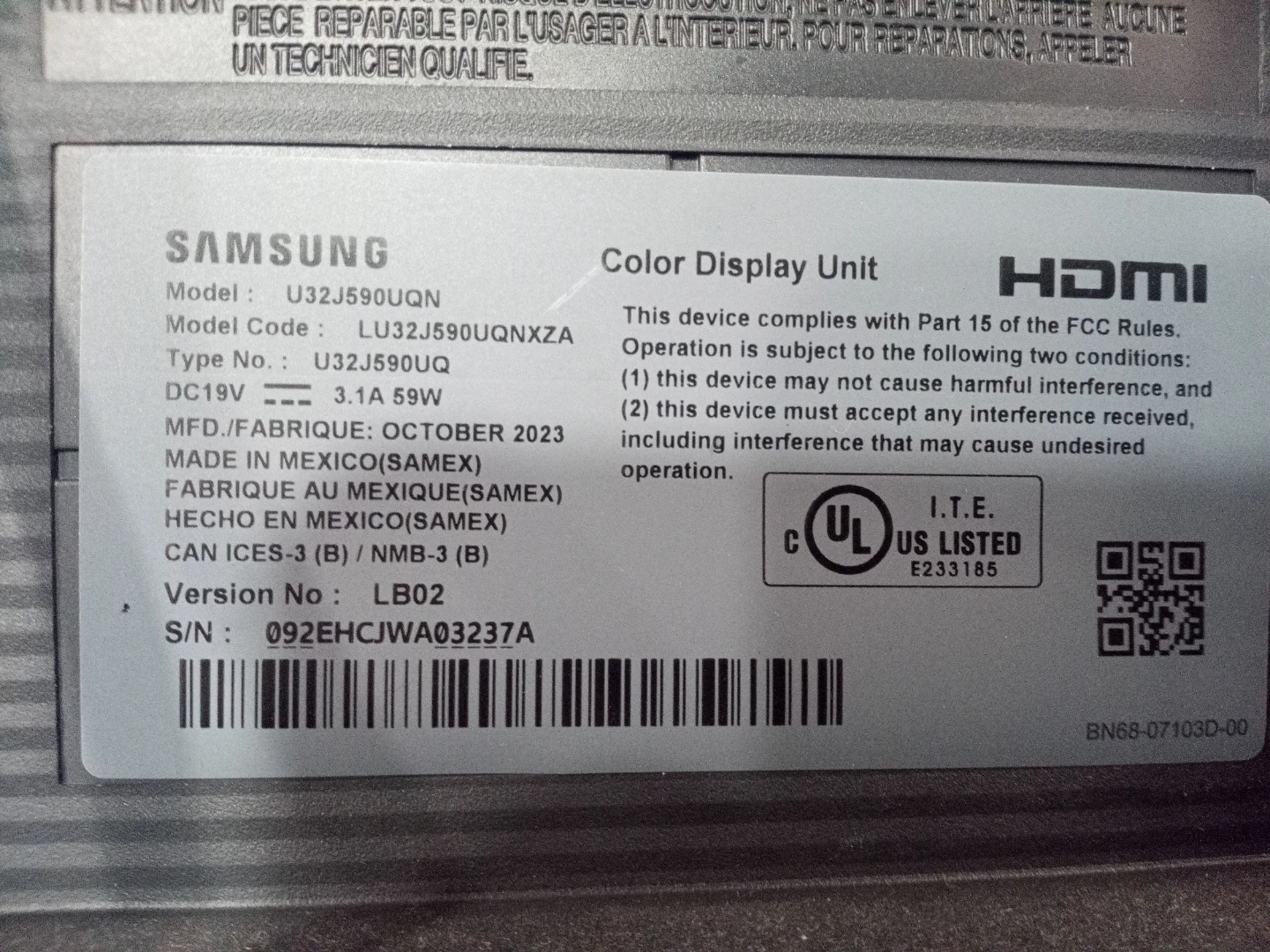 Selling a Samsung 32-inch monitor. The model number is U32J590UQNXZA. Manufactured in October 2023. It's in great condition!
