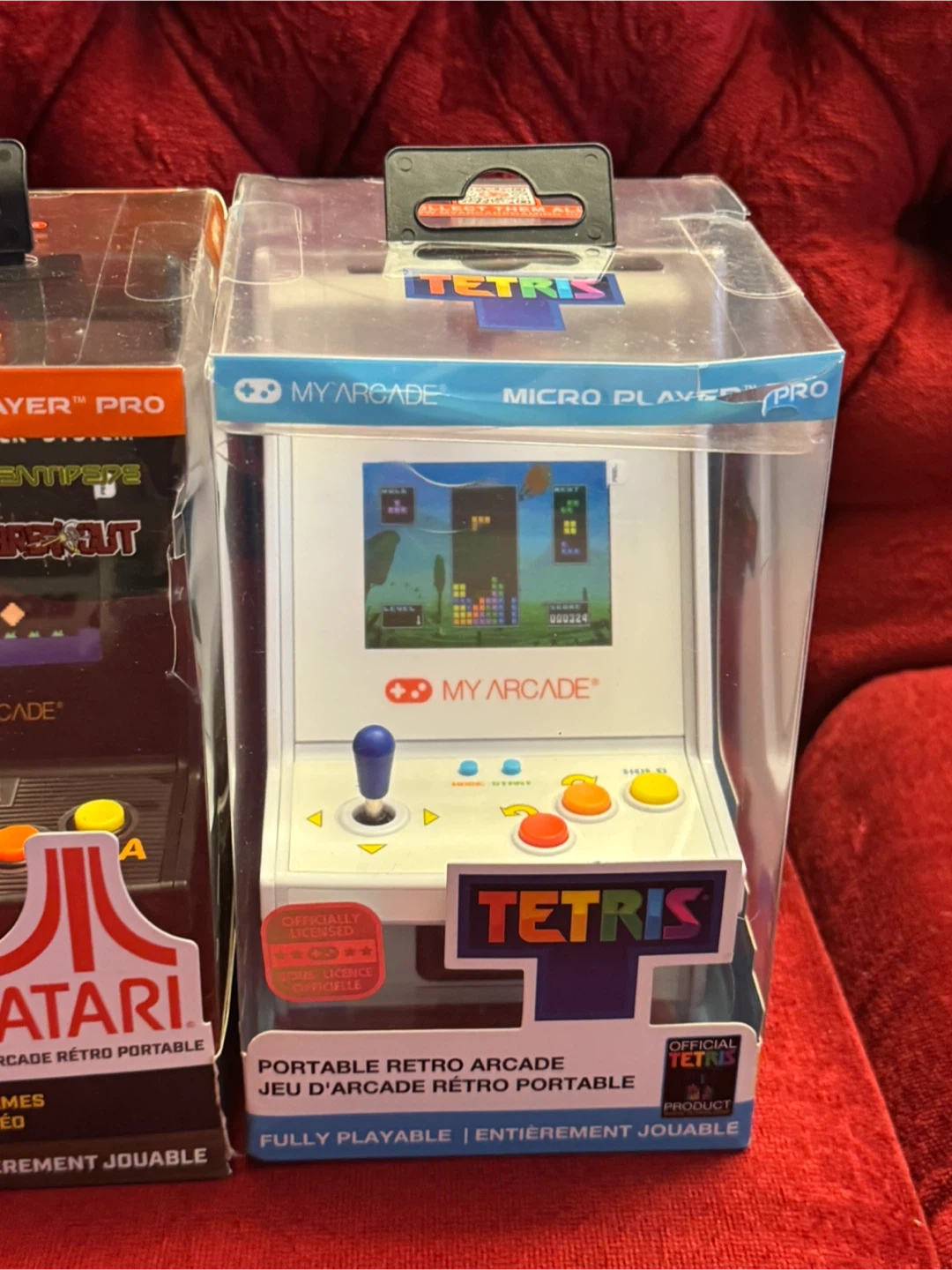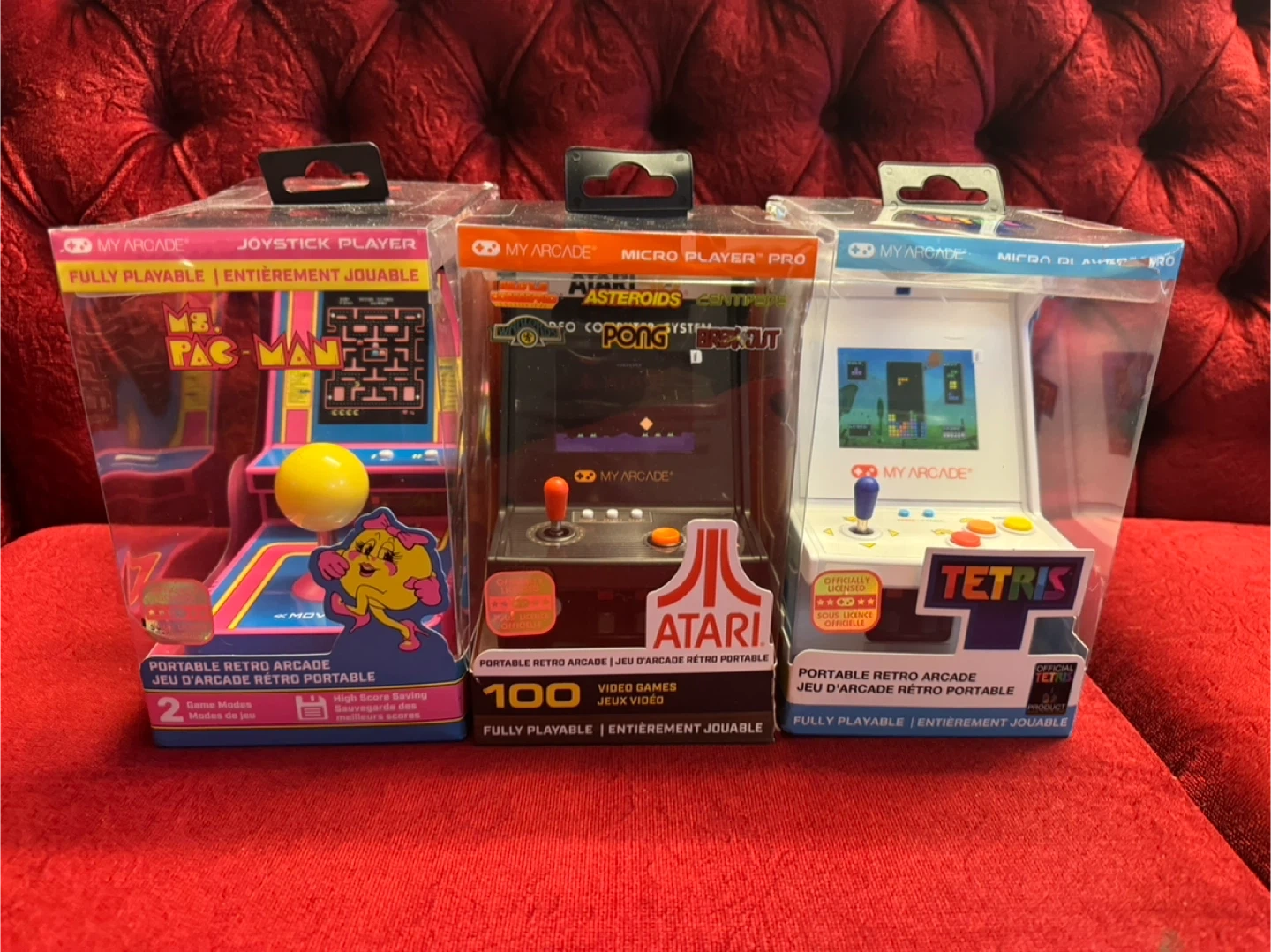 Grab these three fully playable portable retro arcade units! Includes Ms. Pac-Man Joystick Player, and two My Arcade Micro Player Pro units featuring Atari classics and Tetris. These units are in their original packaging and ready for some nostalgic fun!