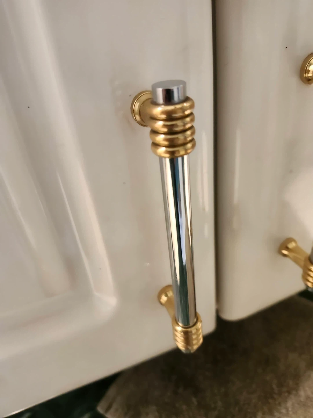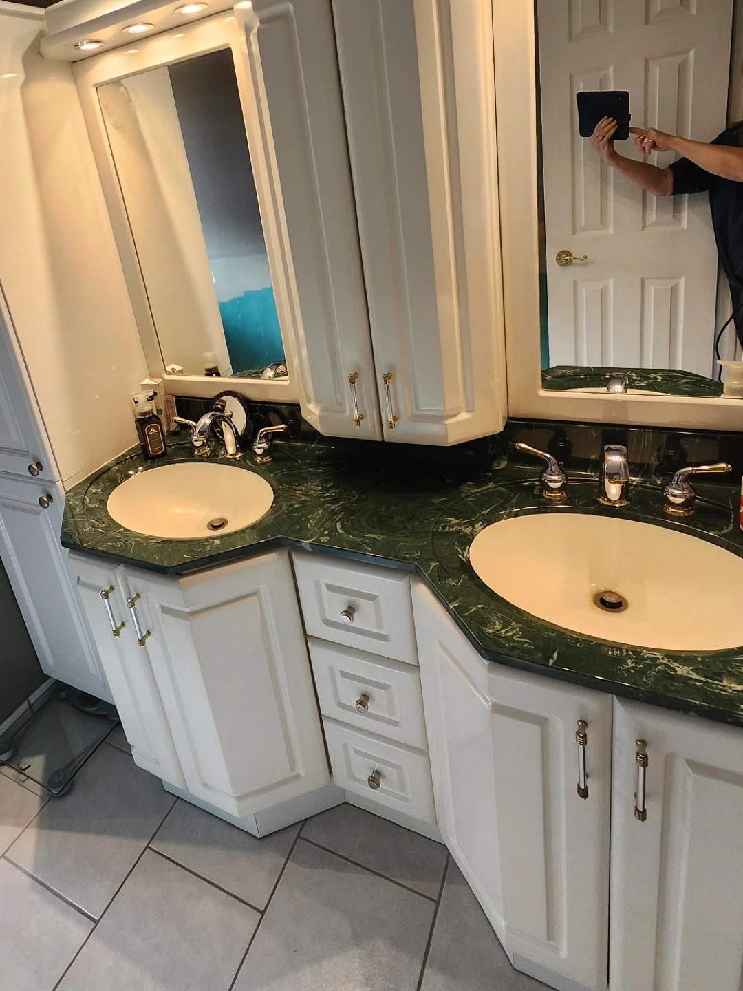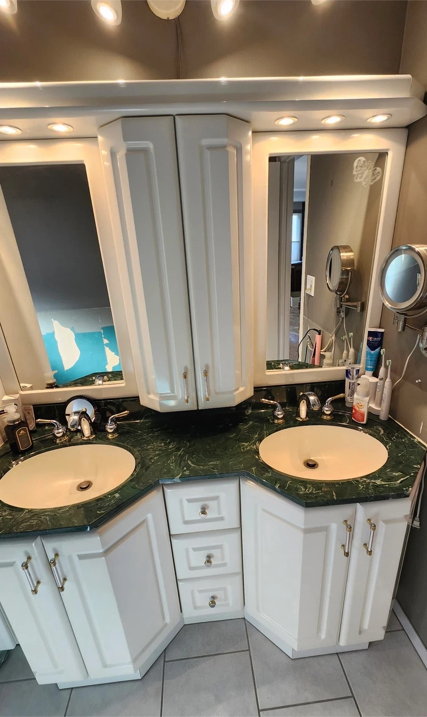 This bathroom vanity features a unique green quartz countertop and two white sinks. It has white cabinetry with gold and silver accent handles. Plenty of storage is available with drawers and cupboard space. Heated Mirrors do not fog up.