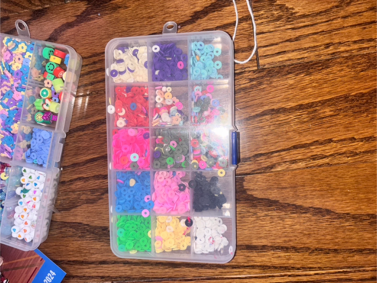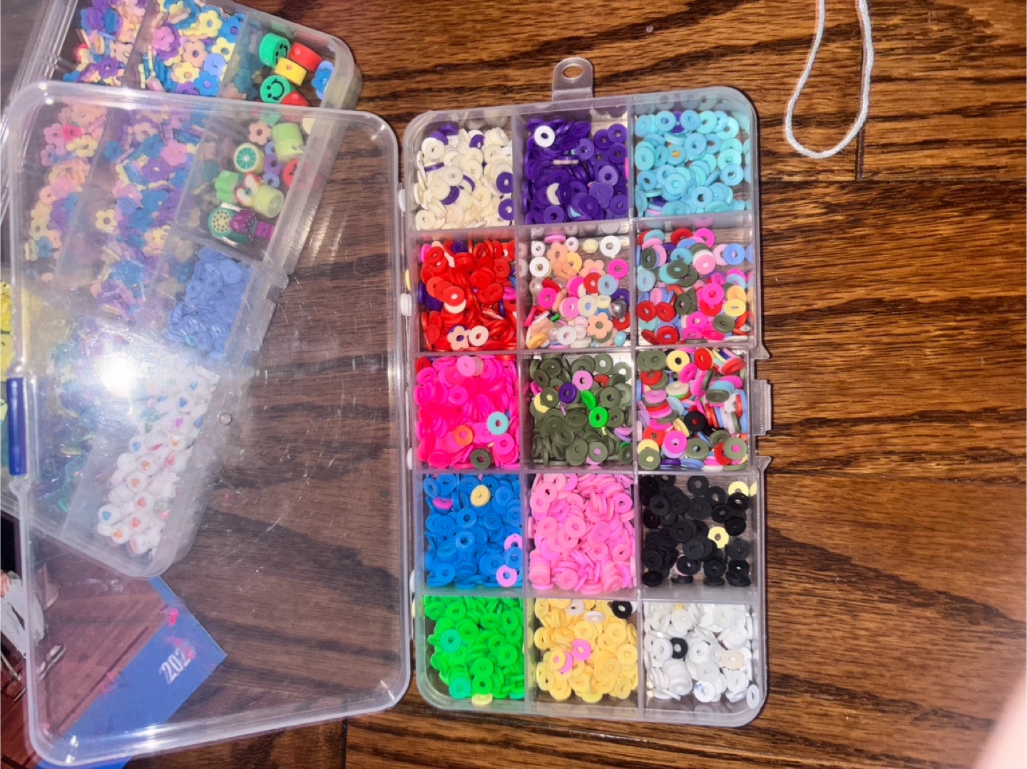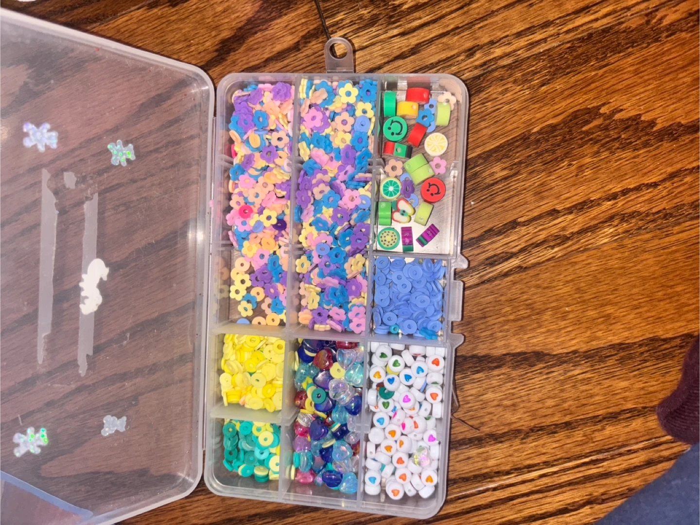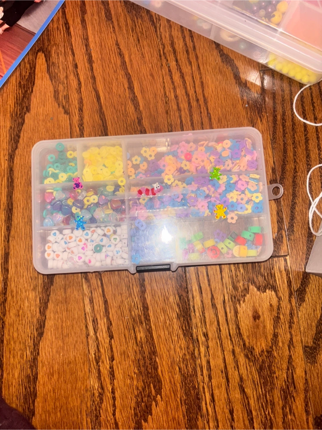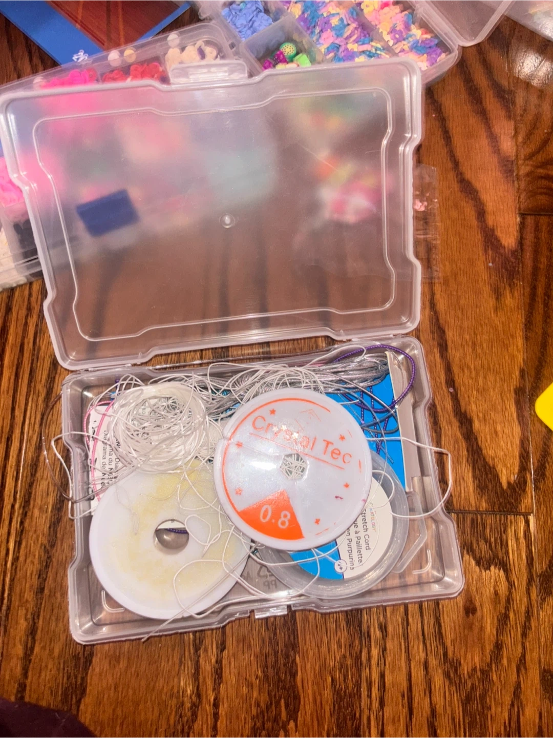 This bead crafting kit includes multiple compartments filled with colourful beads and charms for making jewellery. It also comes with a spool of "Crystal Tec" 0.8mm string. Perfect for creative projects!