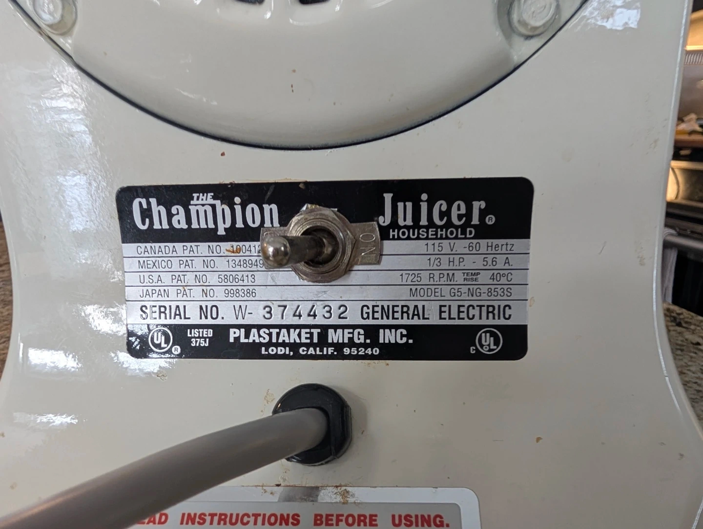 Champion Juicer for household use. This appliance has a toggle switch and operates on 115 V - 60 Hertz. It runs at 1725 R.P.M. Includes various attachments for juicing. General Electric Plastaket Mfg. Inc. Lodi, Calif. 95240. The unit includes 2 maserators, 2 filter screens for pulp size.