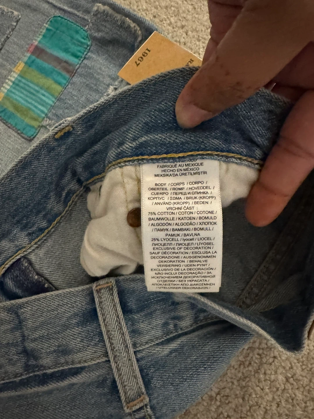 These Polo Ralph Lauren jeans feature a light wash denim with a patchwork design. They're made with 75% cotton, 25% lyocell. Great for a casual, stylish look!
