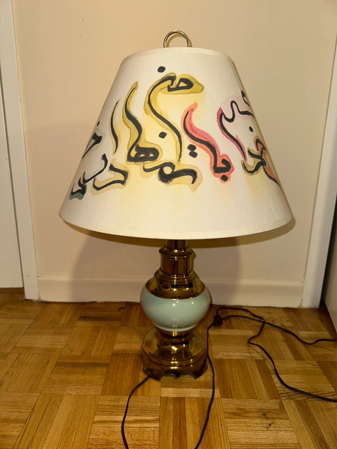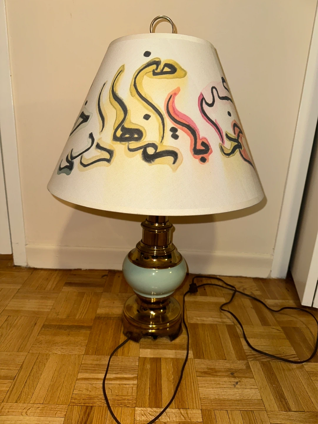 This is a brass-finished table lamp with a unique, hand-painted decorative shade. It features a pale blue accent on the base. The lamp's design offers a distinctive touch to any room.