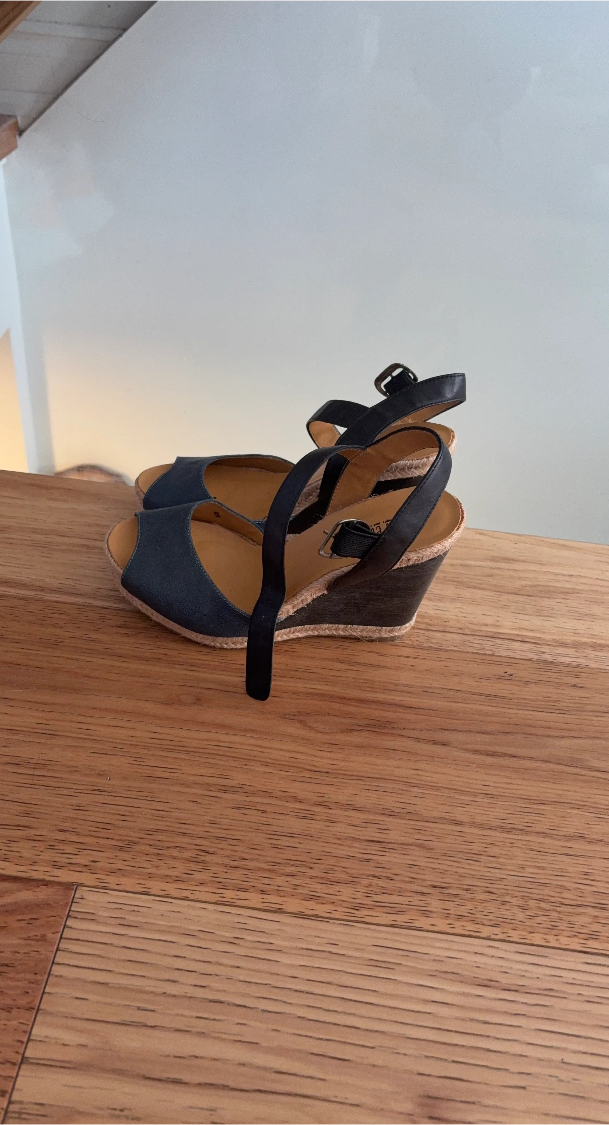 These blue wedge espadrille sandals feature an ankle strap with a buckle closure. The cork and rope detailing on the wedge adds a nice touch. Comfortable and stylish for warm weather!