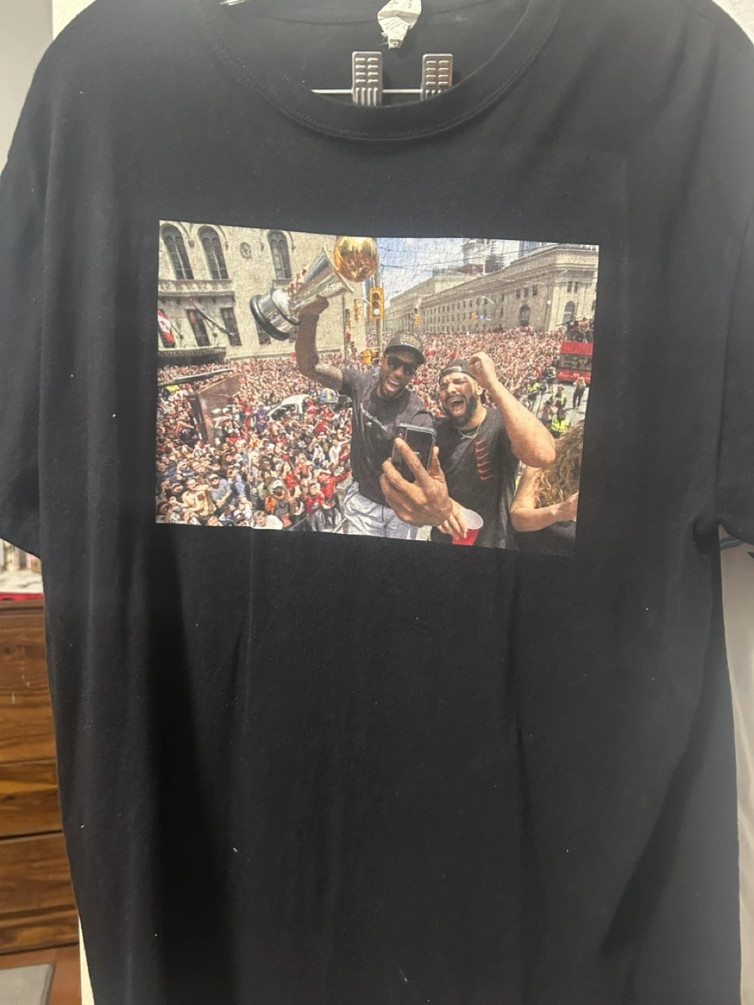 Selling a black t-shirt featuring an image from the Toronto Raptors championship parade. It's in good condition and perfect for any Raptors fan! Kawhi Leonard and Drake