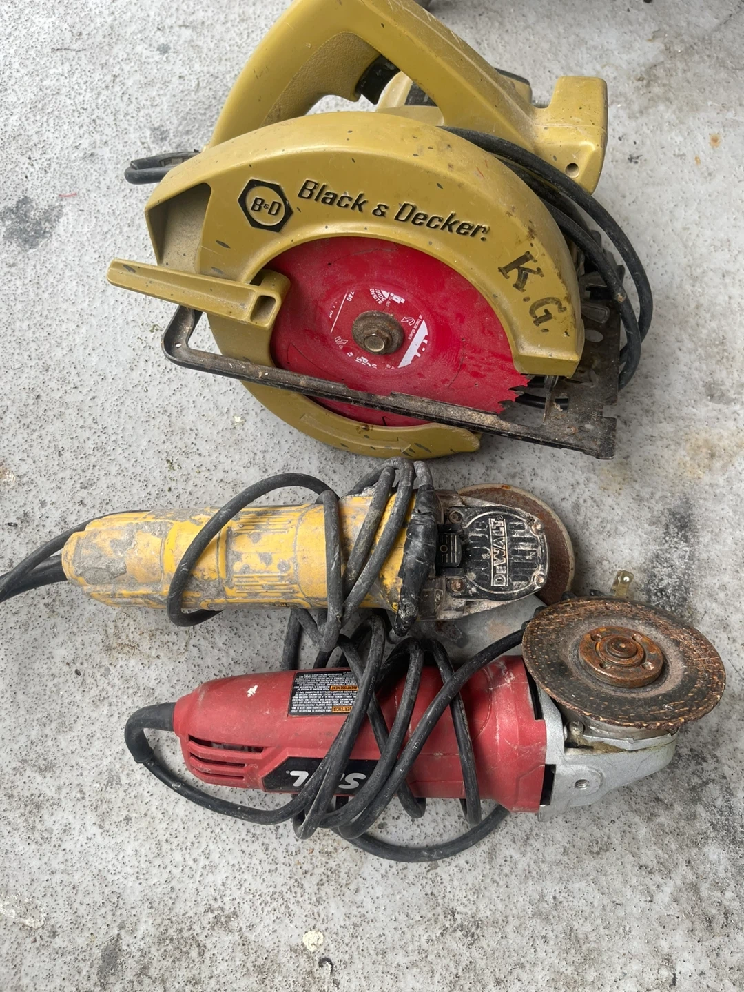 Selling a used Black & Decker circular saw along with two angle grinders (one DeWalt and one unbranded). They show signs of wear and use, as you can see in the photos.