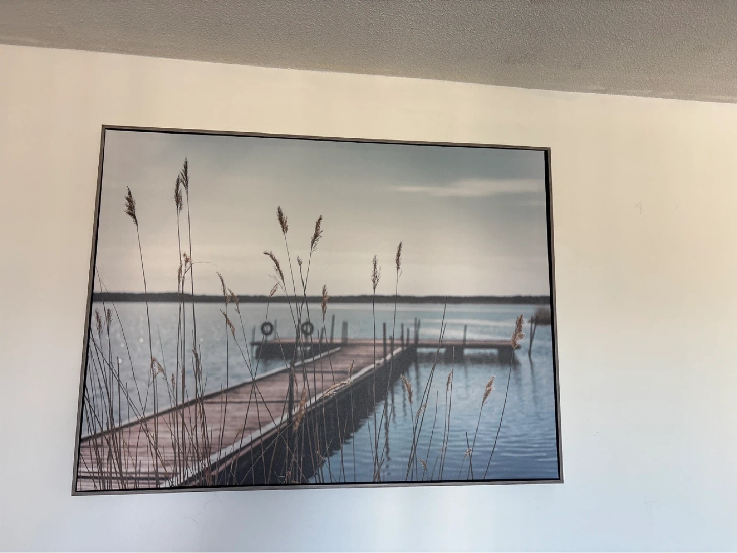 Canvas print of a tranquil lake scene with a wooden dock and tall grasses. It's framed in a sleek, modern metal border. This piece adds a serene touch to any room!