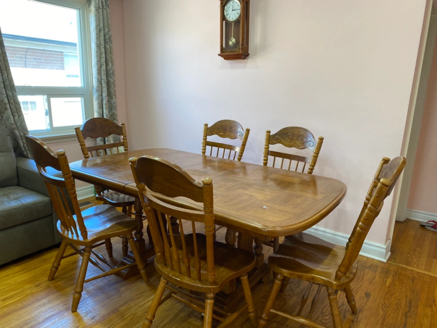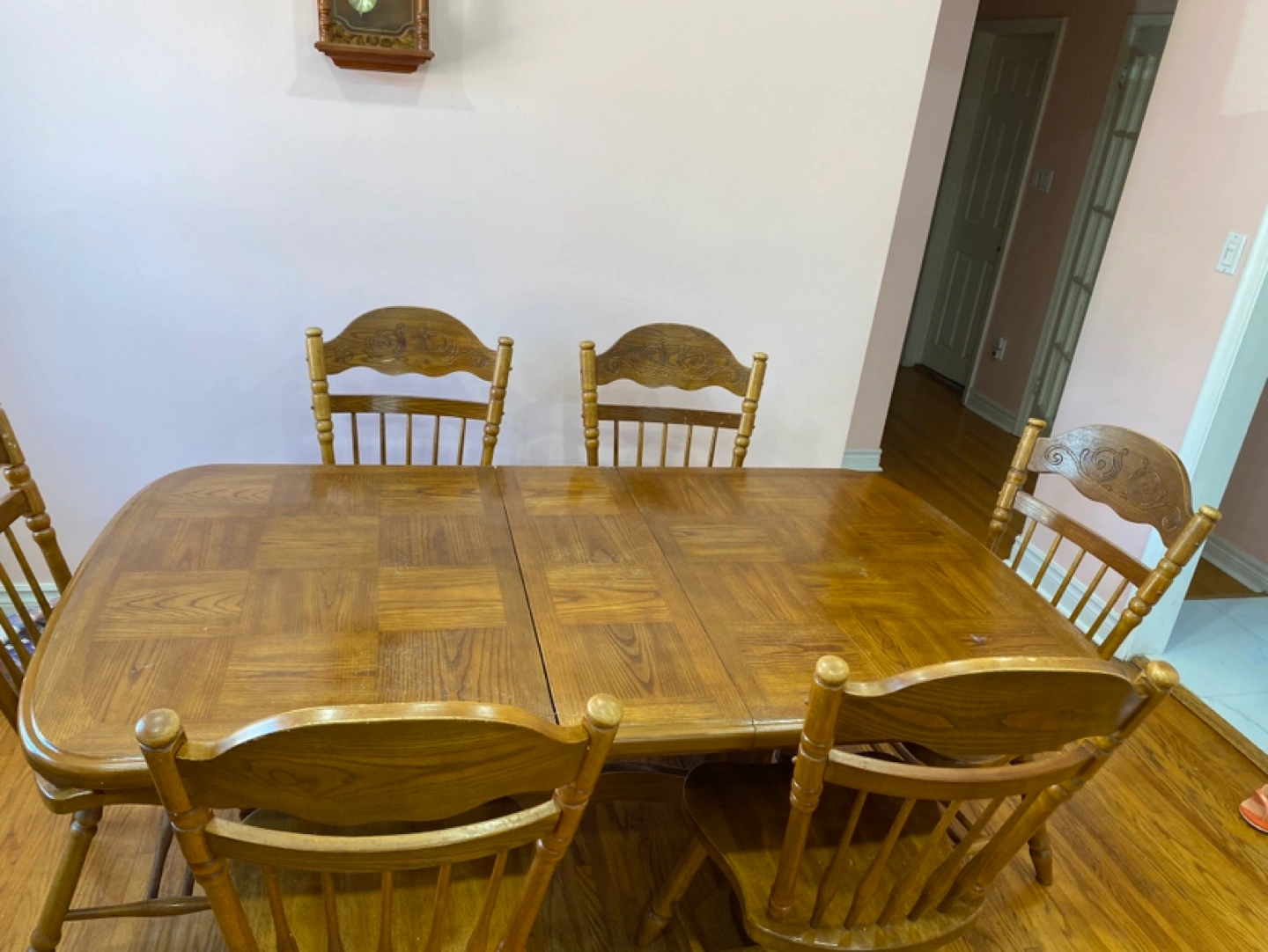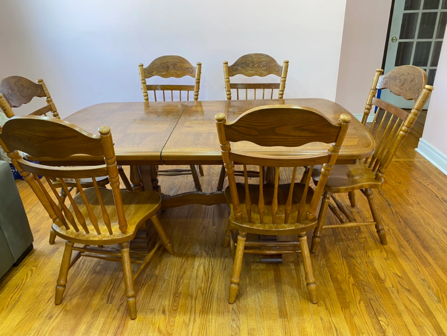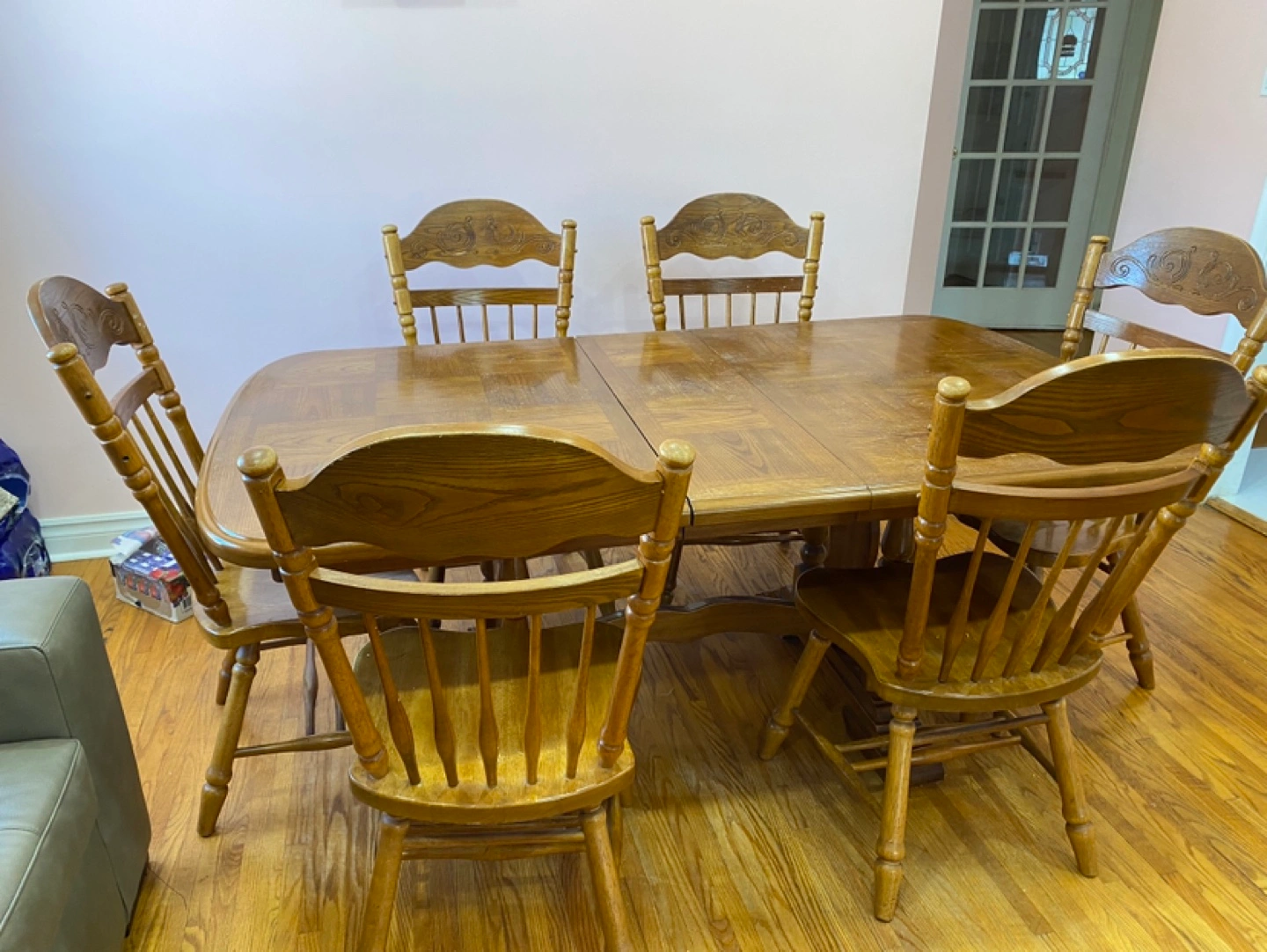 Solid wood dining table and six chairs. Table features an extendable leaf. Traditional design. Some minor wear. (emergency- price is negotiable, item is in very good shape just trying to remove it ASAP due to moving)