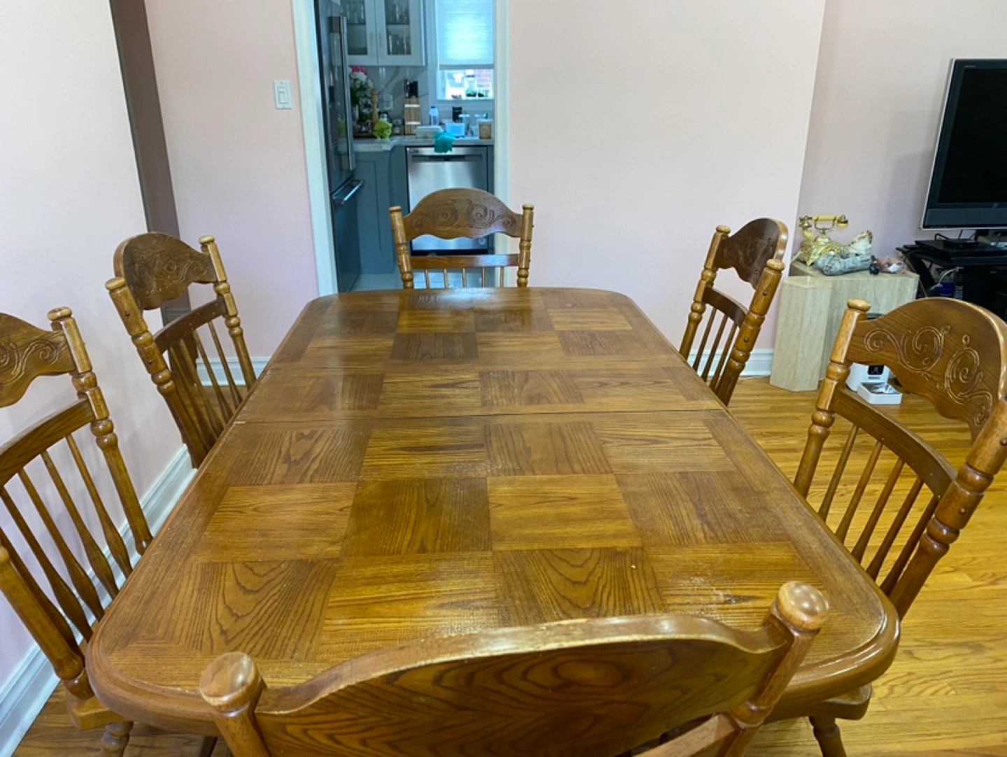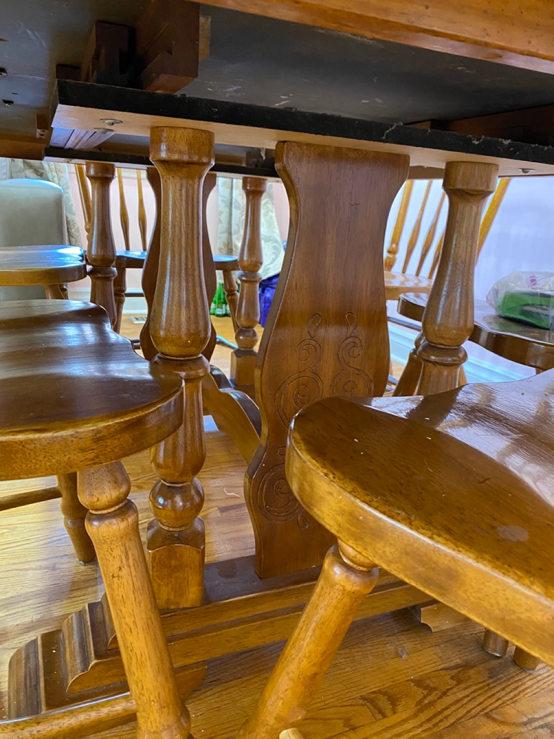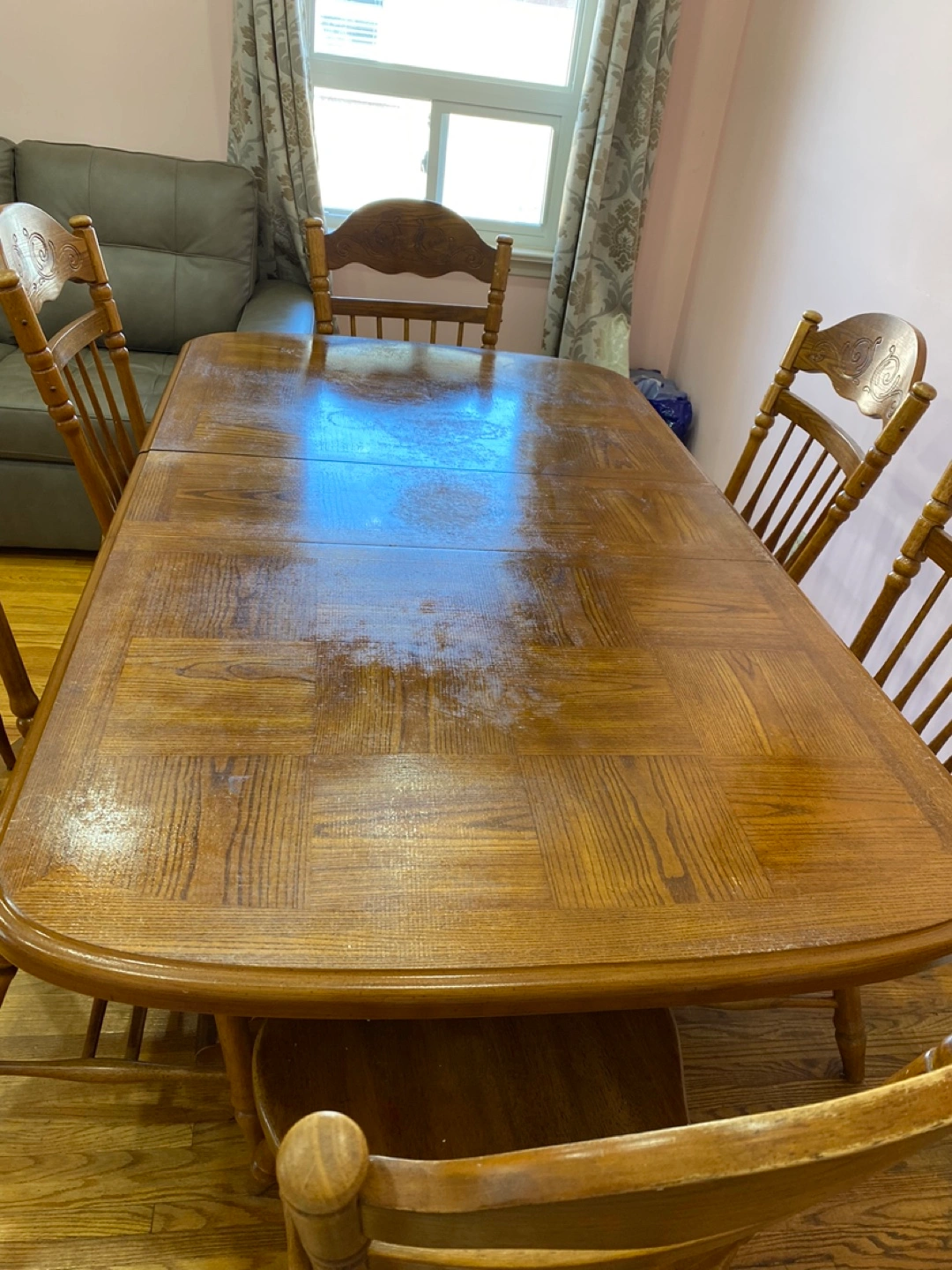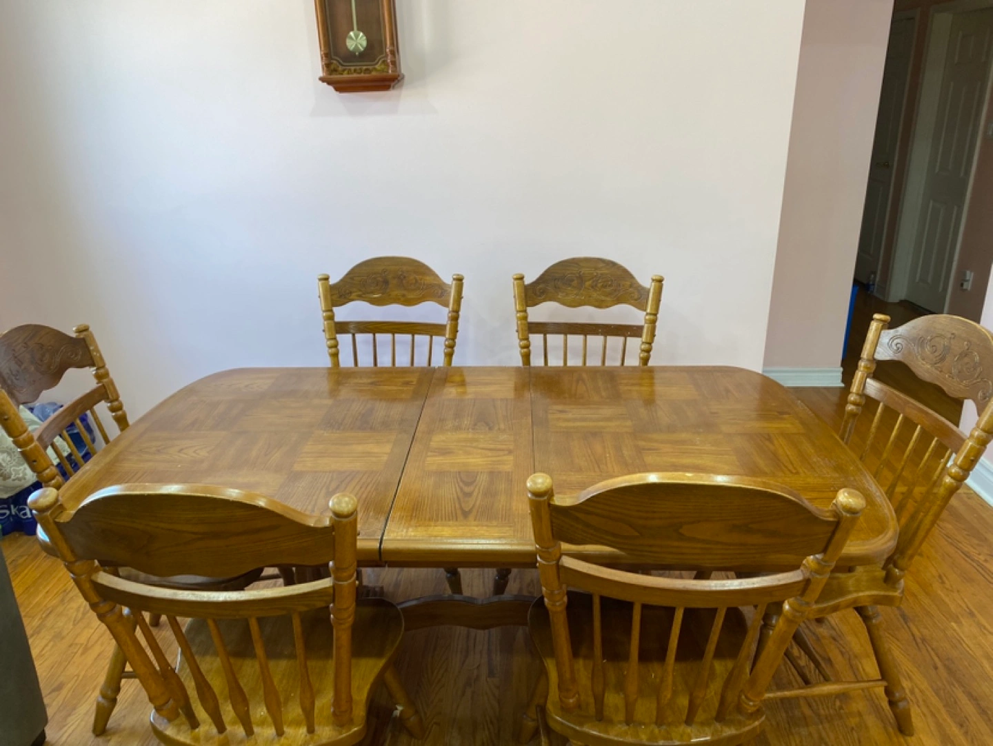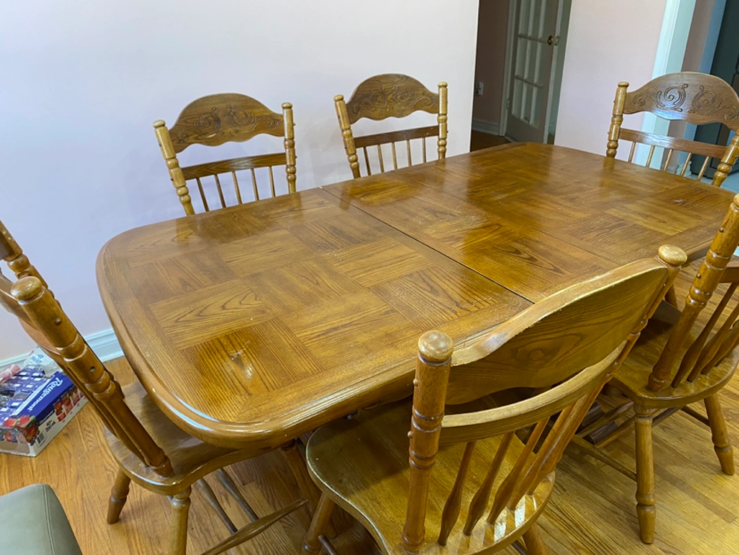 Solid wood dining table and six chairs. Table features an extendable leaf. Traditional design. Some minor wear. (emergency- price is negotiable, item is in very good shape just trying to remove it ASAP due to moving)