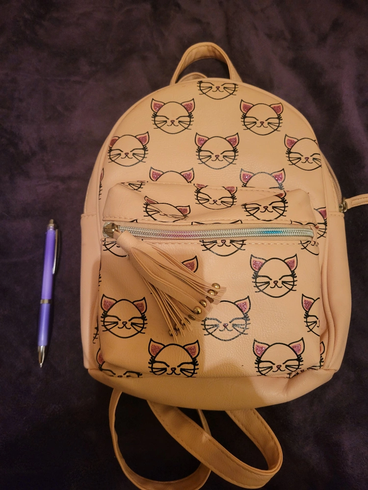 Small pink backpack with a cat design. It has a zippered pocket on the front and a tassel.