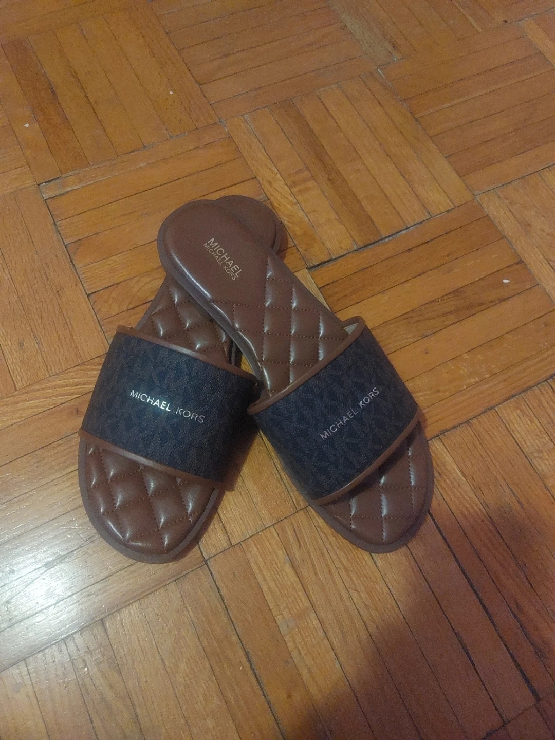 These Michael Kors slides are a stylish brown colour. They feature the signature MK logo pattern on the strap and a quilted footbed. Slip-on style.