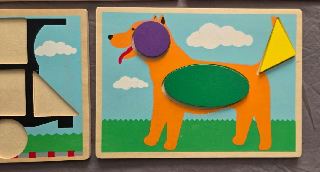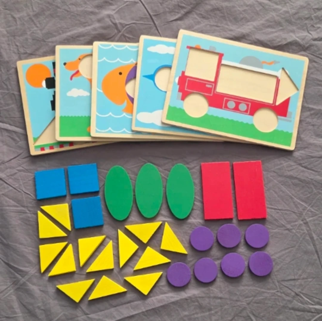 This set includes 5 double-sided wooden puzzle boards with colourful shapes like trucks, birds, fish, dogs, houses, and more! It's great for little ones learning shapes and hand-eye coordination. Pieces are made of durable wood (no damage).