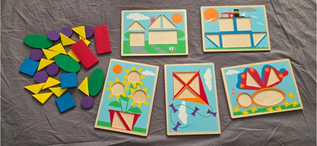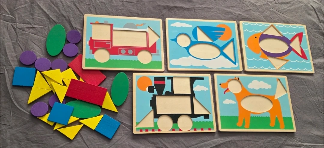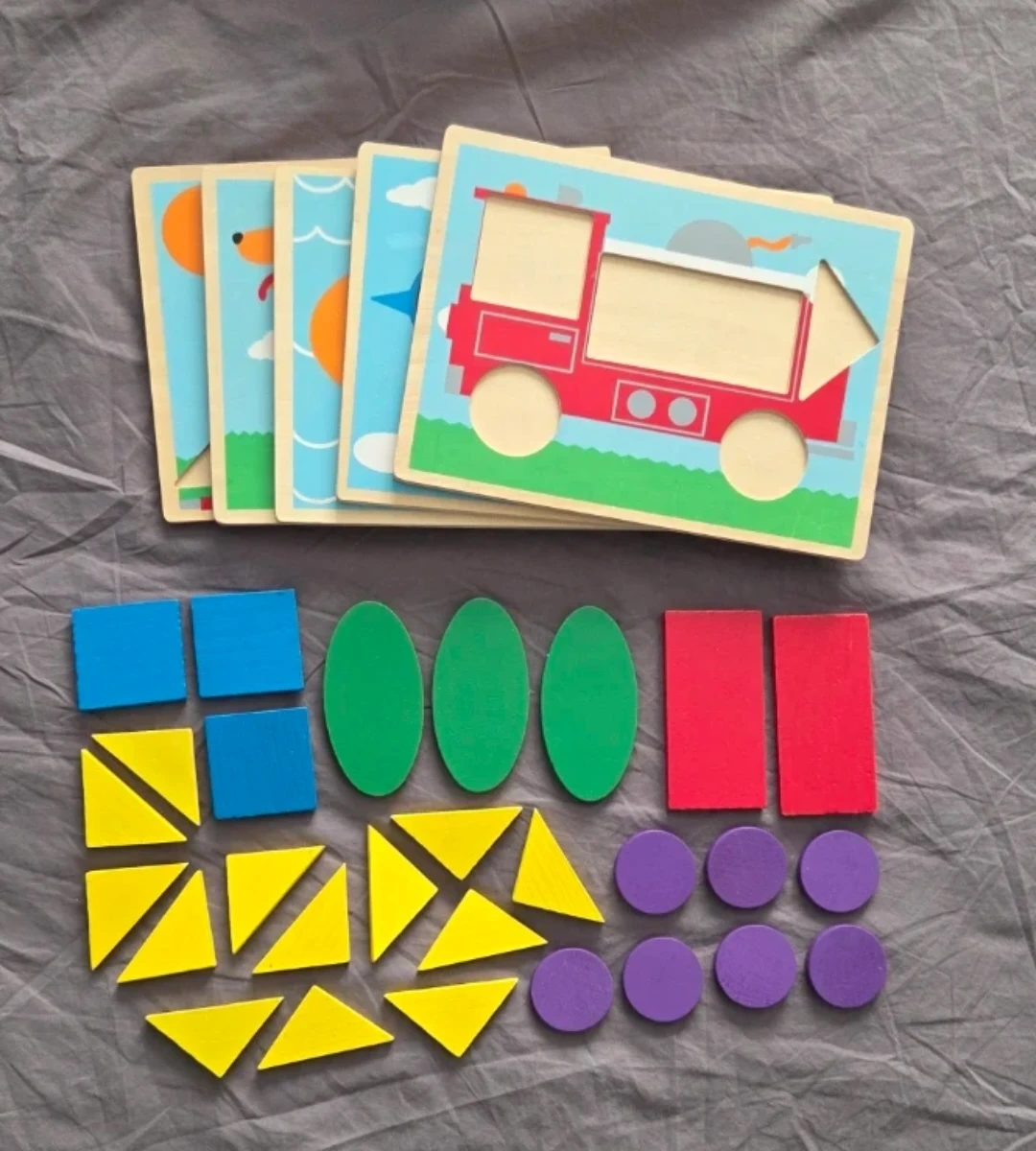 This set includes 5 double-sided wooden puzzle boards with colourful shapes like trucks, birds, fish, dogs, houses, and more! It's great for little ones learning shapes and hand-eye coordination. Pieces are made of durable wood (no damage).