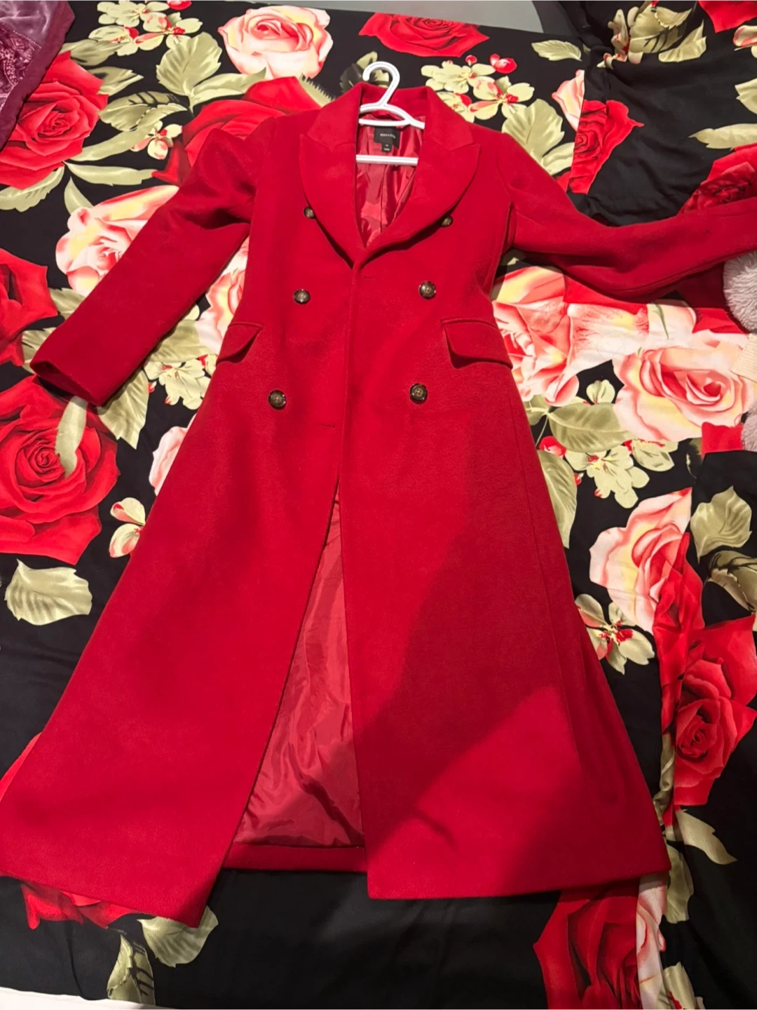 This is a beautiful red belted double breasted overcoat. It's perfect for adding a pop of colour to your winter wardrobe. It's in great condition and ready for a new owner
