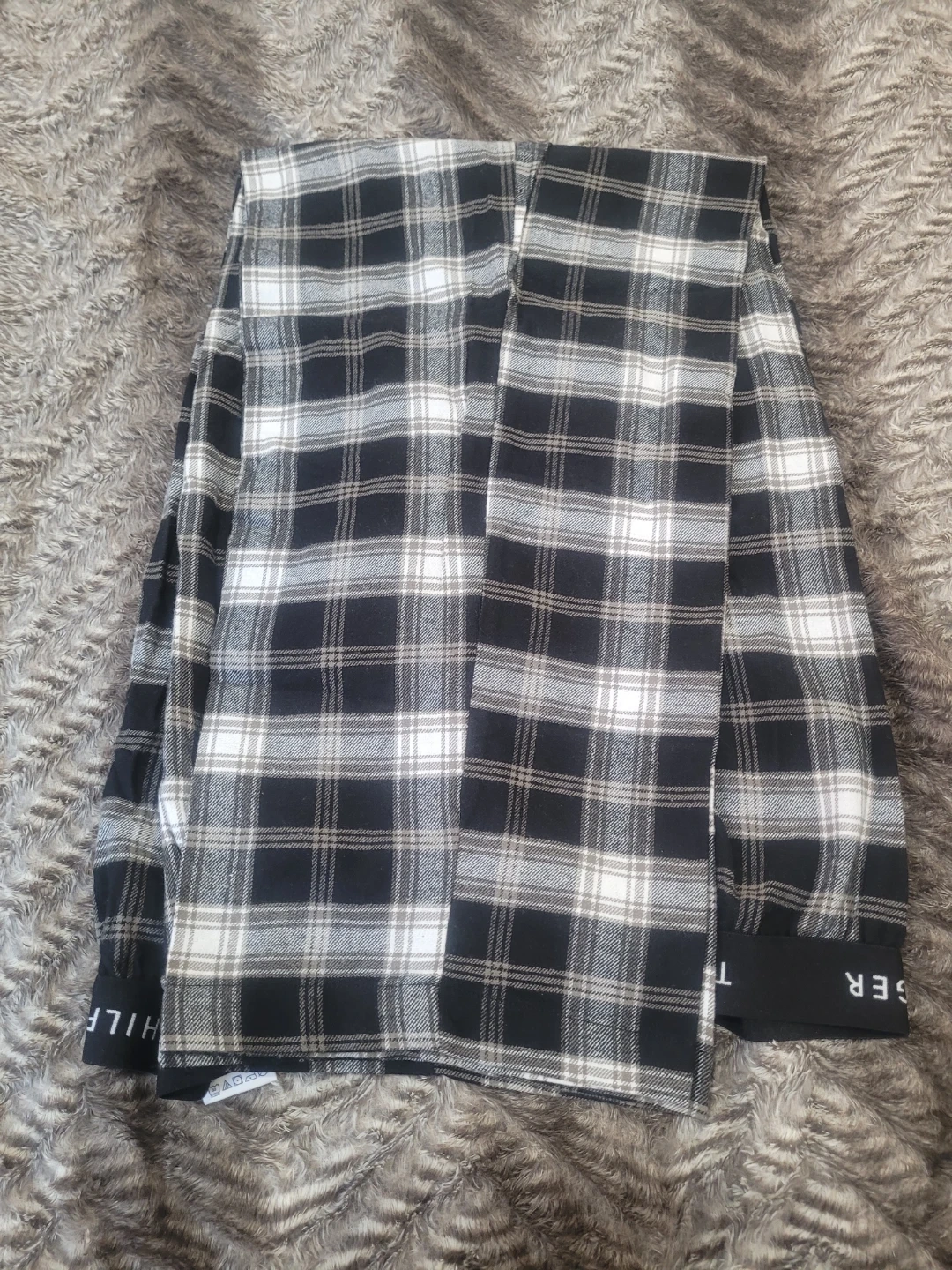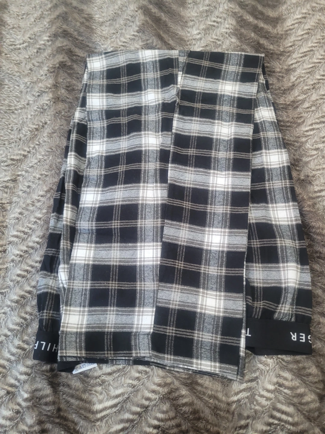 Black and white plaid flannel shirt from Tommy Hilfiger. It has the brand name printed on the cuffs. Material is soft and comfortable for casual wear.