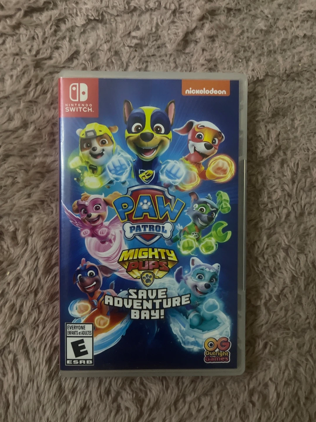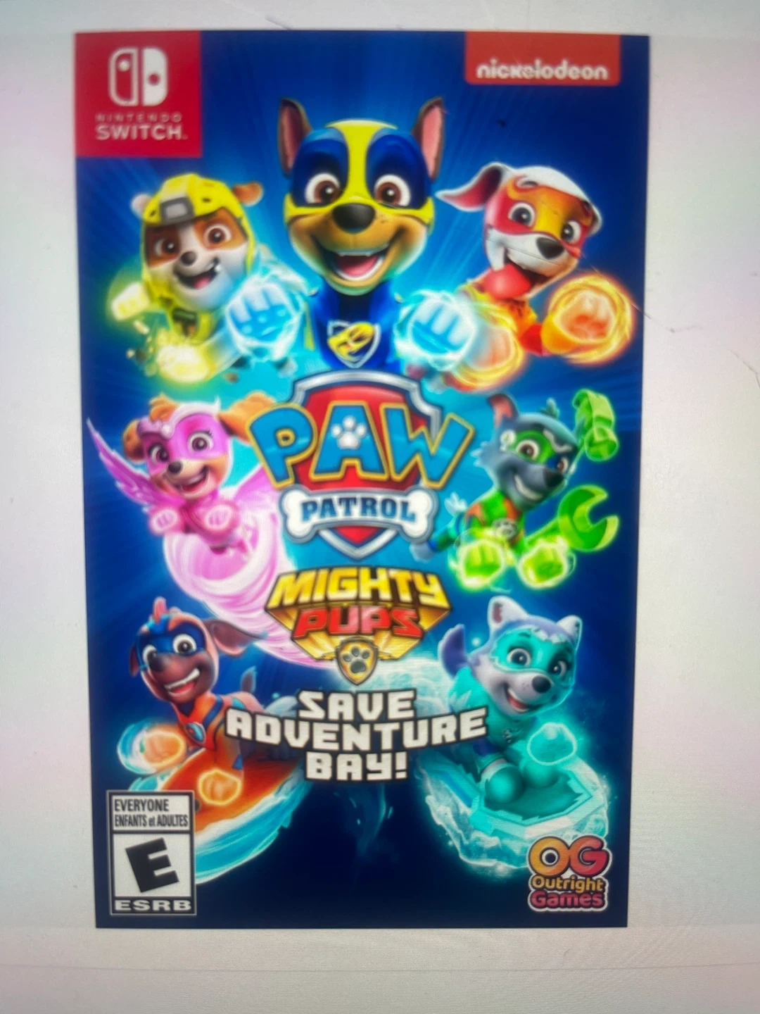 Paw Patrol Mighty Pups Save Adventure Bay game for Nintendo Switch. Includes game case and cartridge. Rated E for Everyone.